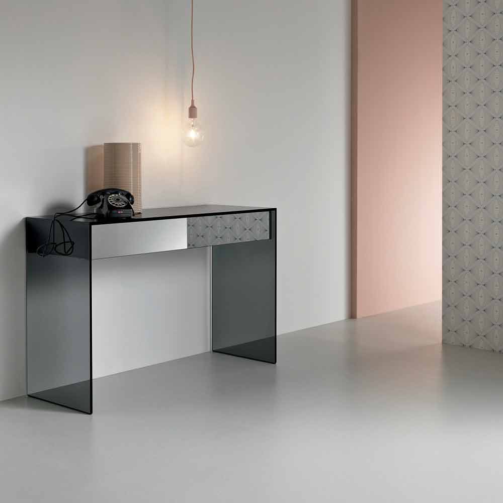 Consola de escritorio en disño moderno hecho a mano en Italia de vidrio ahumado con cajón de madera.