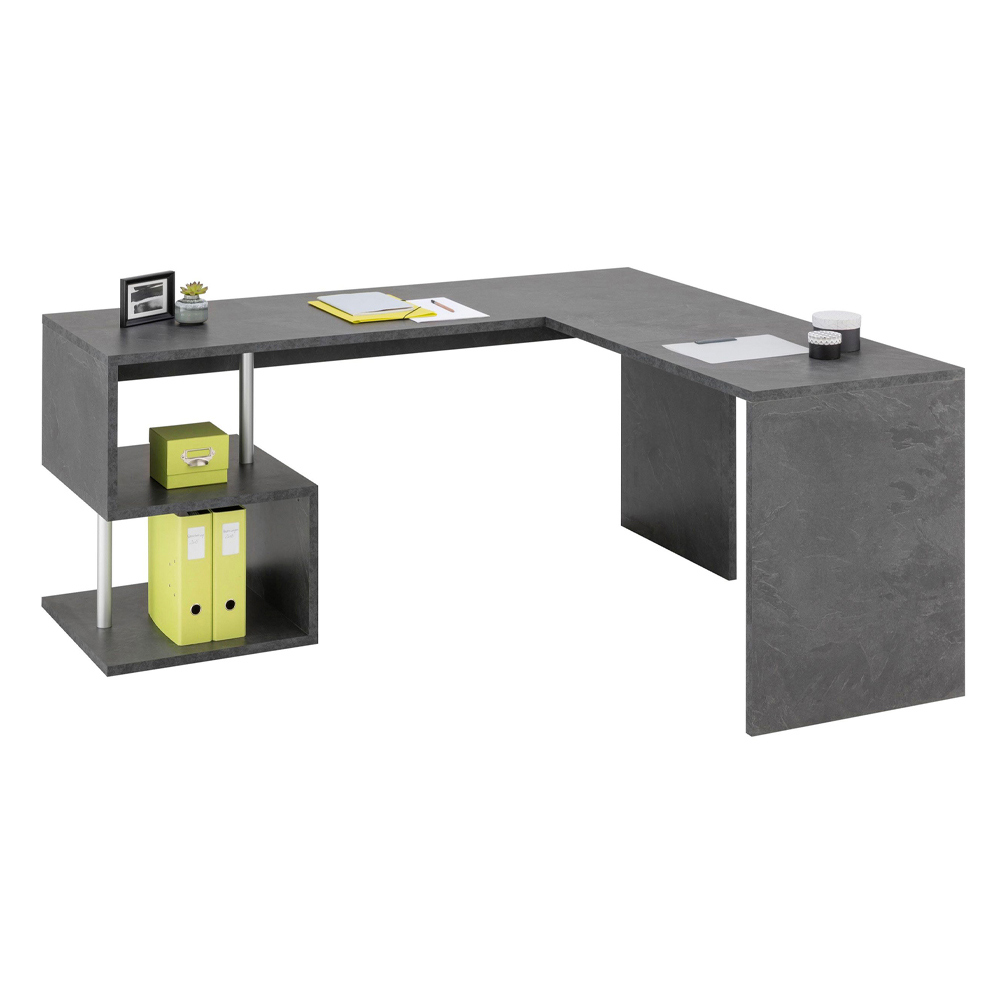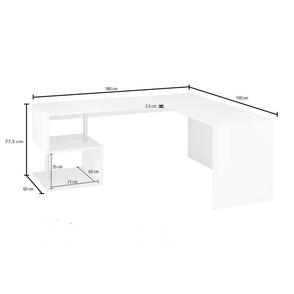 El escritorio rinconera se caracteriza por su diseño moderno con un práctico estante lateral en forma de "S" con 2 compartimentos abiertos que le da a la estructura un aspecto particular y actual. Se puede utilizar como escritorio o escritorio de trabajo, está fabricado en madera de melamina sostenible resistente y resistente revestida en resina de melamina disponible en dos acabados.