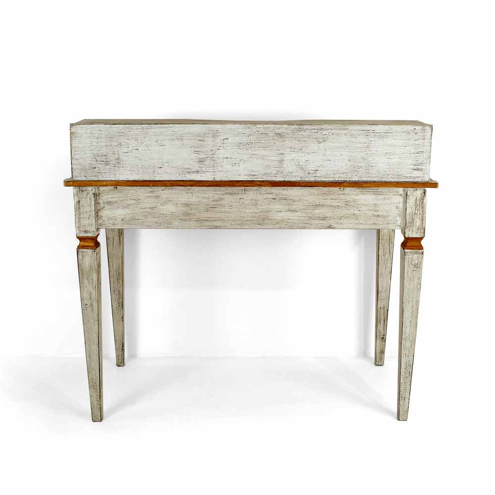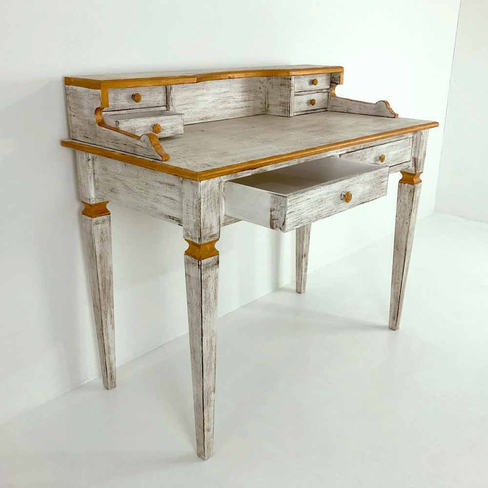 Escritoriohecho a mano en Italia en madera maciza de abeto con acabado blanco envejecido enriquecido con perfiles y detalles en color oro antiguo. Su estructura cuenta además con un práctico protector contra salpicaduras fácilmente extraíble que te permite obtener un total de 6 cajones, ideal para ordenar y organizar tus objetos.