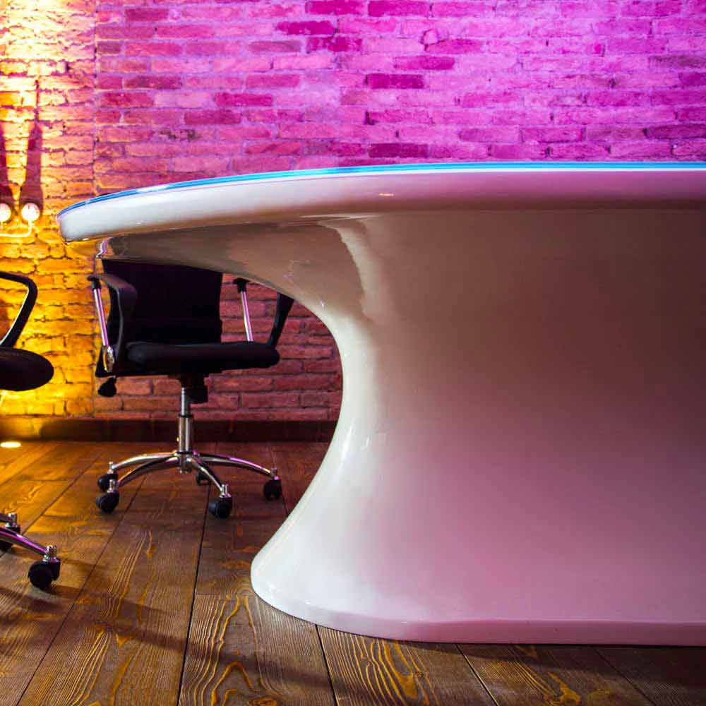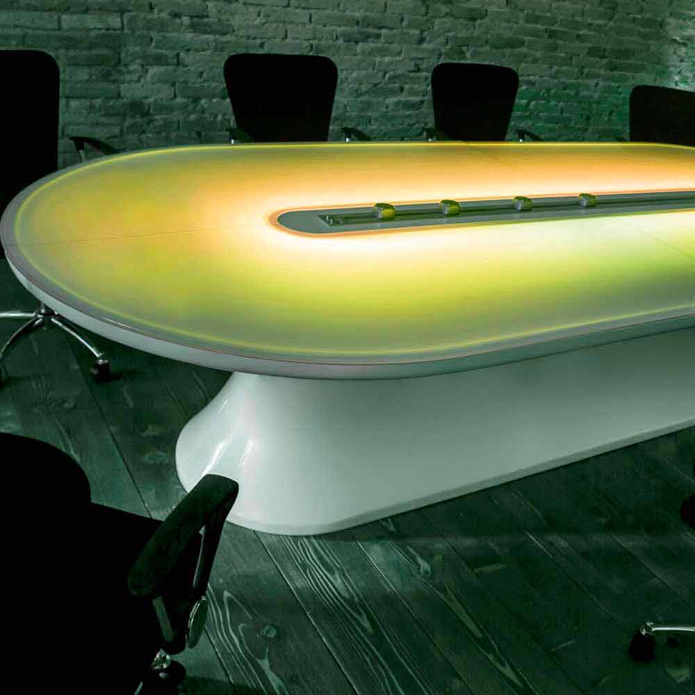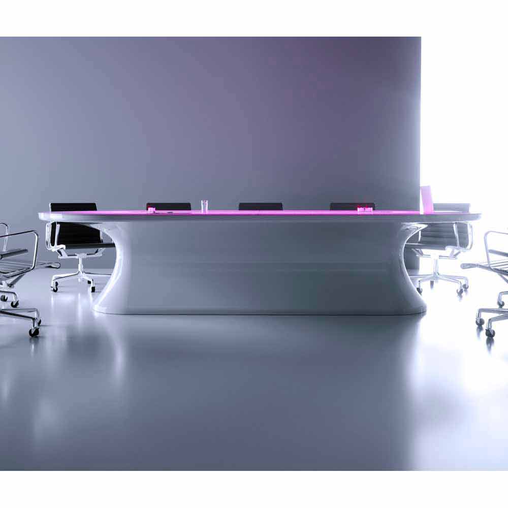 Material: adamatx y cristal. Mesa de reuniones de diseño, elegancia y tecnología. Con formas sinuosas y espacios generosos, la mesa informativa es una verdadera obra de arte. Personalizable en colores y tamaño. Además del aspecto estético, la mesa de información también es tecnológicamente avanzada, gracias a la cromoterapia de las luces RGB bajo el cristal, pero sobre todo gracias a la barra electrificada colocada en el centro de la mesa, que permite cualquier tipo de conexión desde cualquier lugar. . Superficie sólida; Es un material innovador con el que es posible crear cualquier forma, crear objetos y proyectos con un diseño único. Se trata de un material compuesto, obtenido a partir del procesamiento de espumas recubiertas con resinas especiales, que está revolucionando el mundo del diseño. Un material que surge de años de estudio, experimentación y pruebas técnicas de laboratorio. VENTAJAS : - Fácilmente lavable - Muy alta resistencia al desgaste - Aspecto monolítico - Versátil: se puede realizar cualquier forma - Ligero: es un material compuesto, de una ligereza única, por lo que es fácil transportable - Resistente - Sólido : es tan realizable y adaptable a diversas necesidades que puede crear superficies duras. variable, hasta a prueba de balas - Uniformidad : no tiene ningún tipo de junta visible