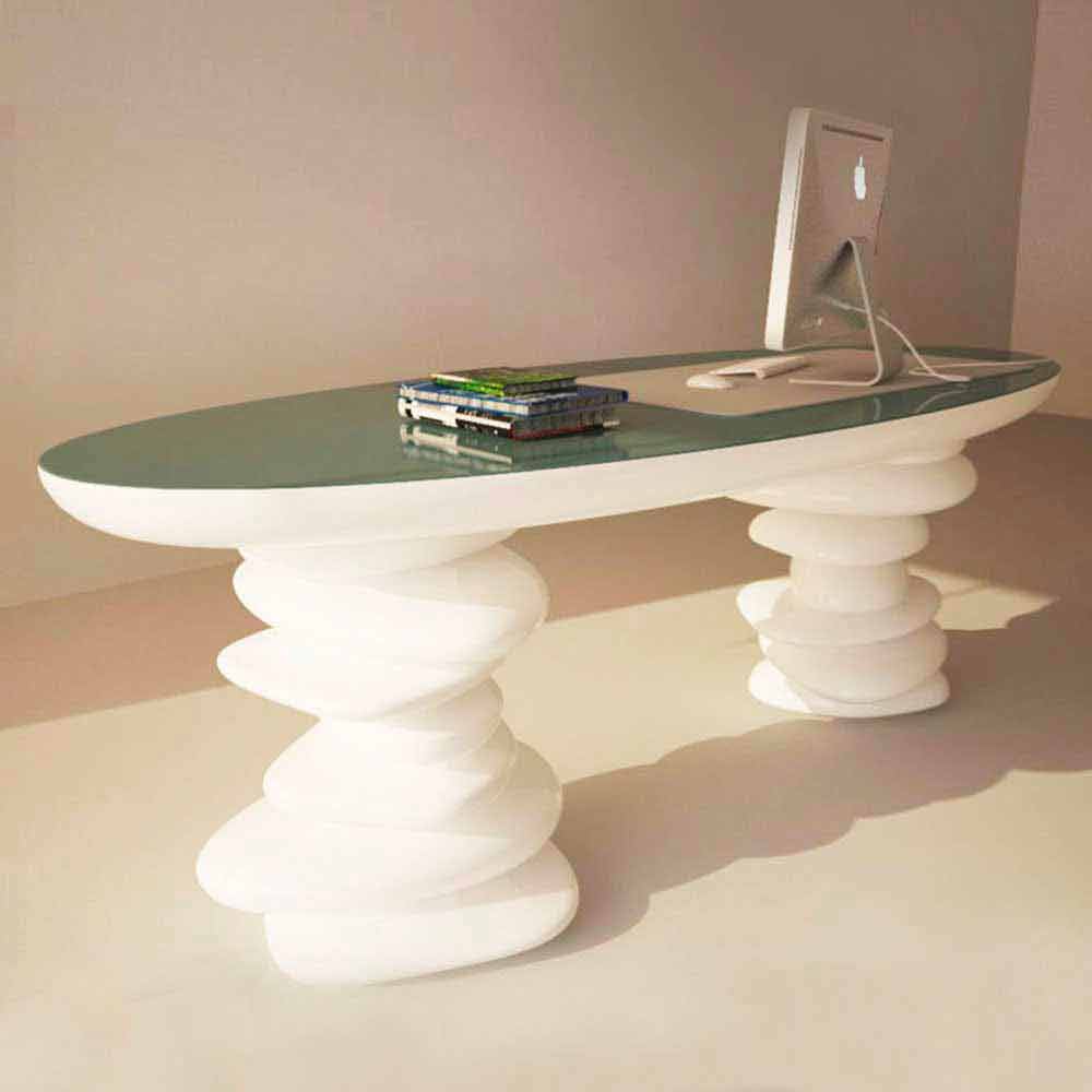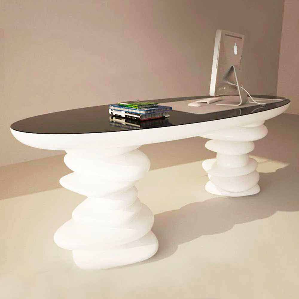 Diseño de interiores. Material: Superficie sólida; Un espléndido ejemplo de diseño original absolutamente recomendable en un proyecto de interiorismo moderno. El escritorio Aldington se puede utilizar no sólo como mesa de reuniones en la oficina, sino también como mesa de comedor o mostrador de recepción. Las dos patas que lo sostienen tienen forma de petras superpuestas. Acabado lacado brillo. Disponible en diferentes variaciones de color.