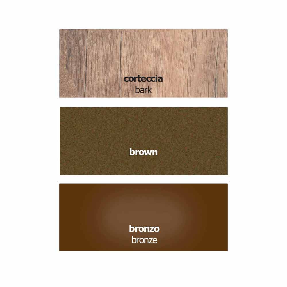 Escritorio suspendido con fijación a pared made in Italy con tapa en melamina acabado corteza con pasacables, estructura en metal pintado marrón y panel vertical desmontable en plexiglás bronce . También se completa con un práctico cajón extraíble a juego con la estructura.