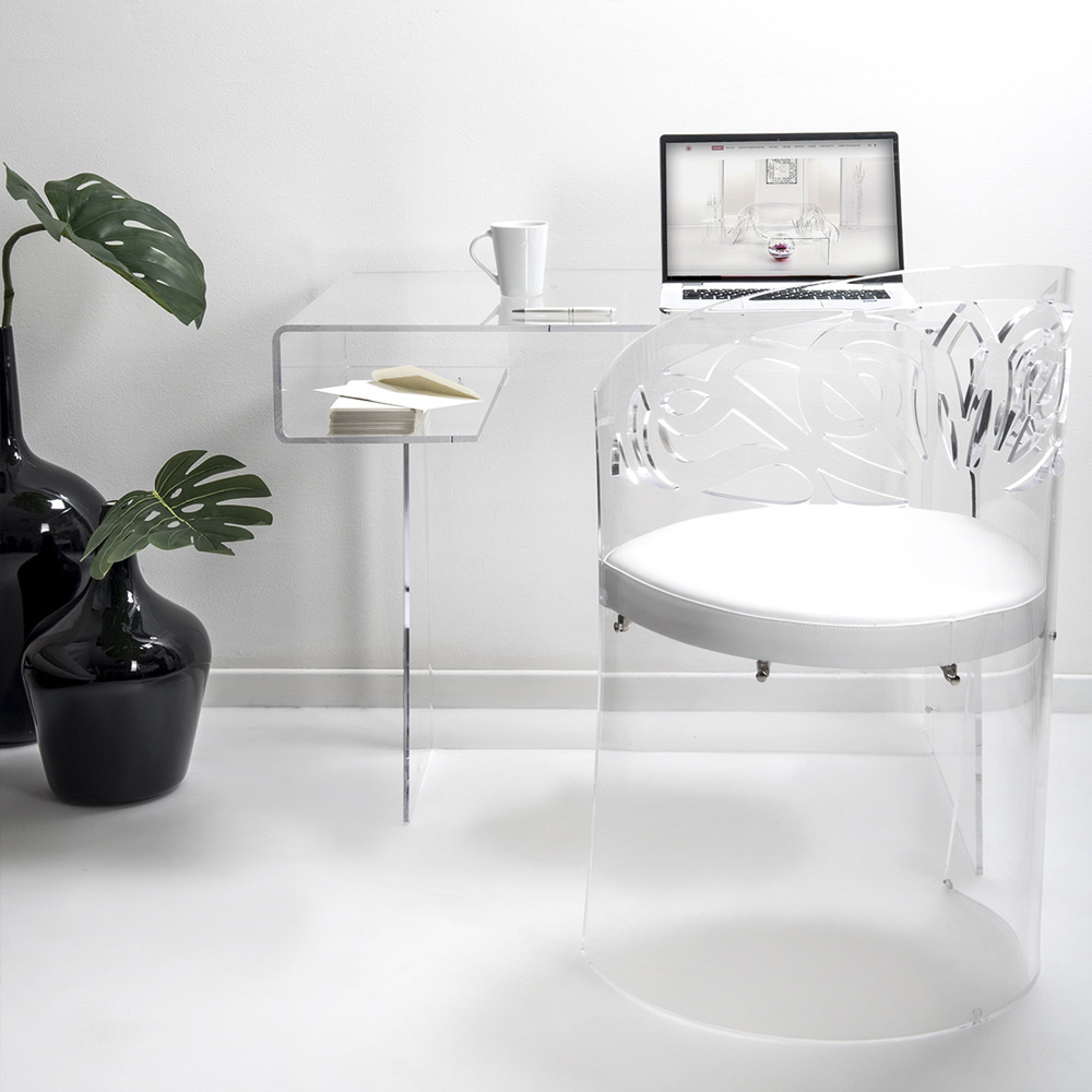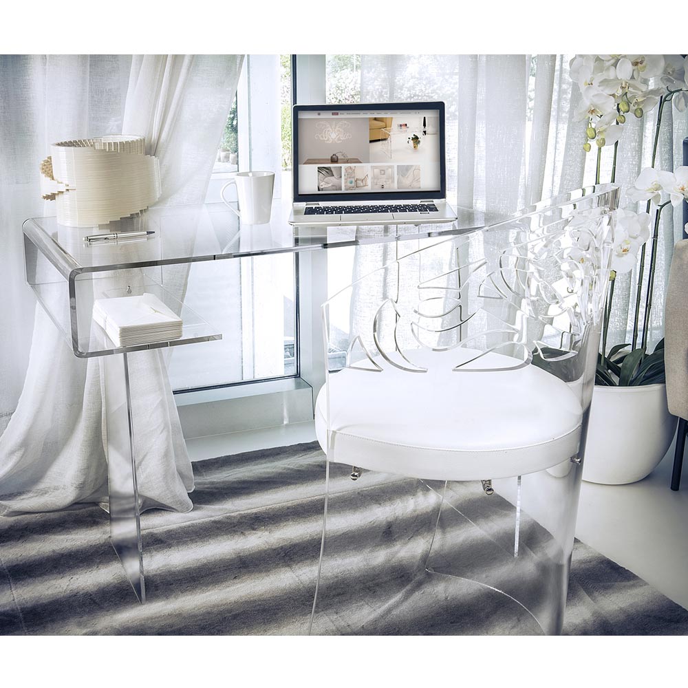 Escritorio de práctico diseño fabricado íntegramente en plexiglás de PMMA100% de polímero virgen en acabado transparente. Este mueble ha sido diseñado para aquellos que necesitan una superficie de apoyo sencilla e imprescindible para estudiar o trabajar desde casa; actúa al mismo tiempo como un mueble moderno , simple y altamente funcional capaz de enriquecer el mobiliario circundante con personalidad y gusto .