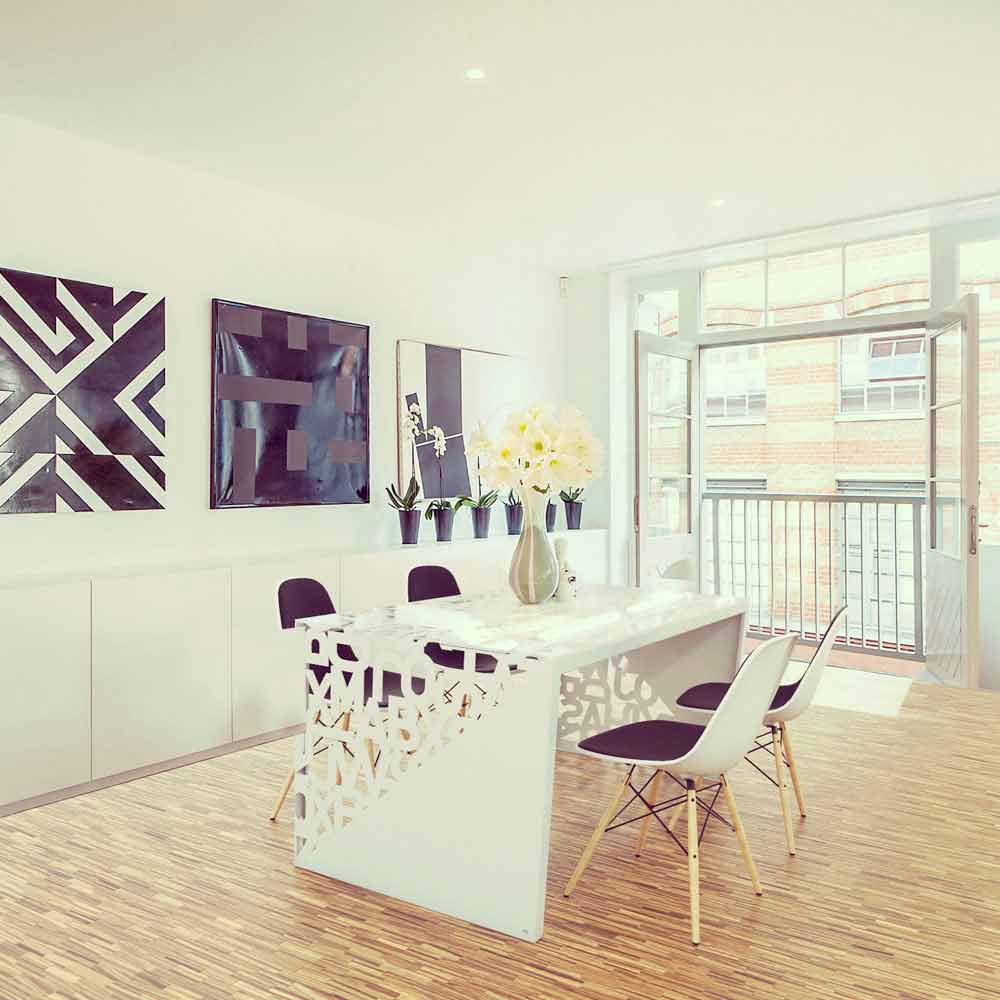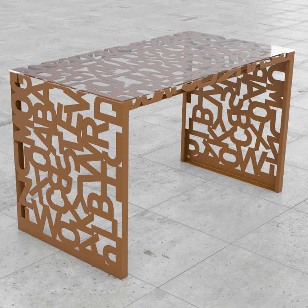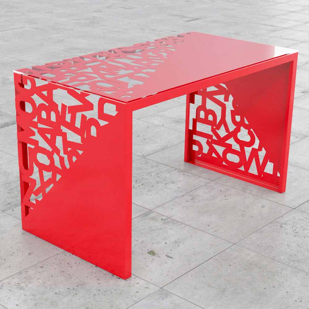 Kattedra surge de una sola hoja de metal doblado y bordado con corte por láser para formar una superficie original de letras. Una mesa con un diseño moderno, visualmente atractiva sino también muy funcional, gracias a la parte superior de vidrio templado. Un mueble perfecto para el estudio, habitación de los niños o de la oficina, Kattedra está disponible en negro, blanco, rojo y antracita.