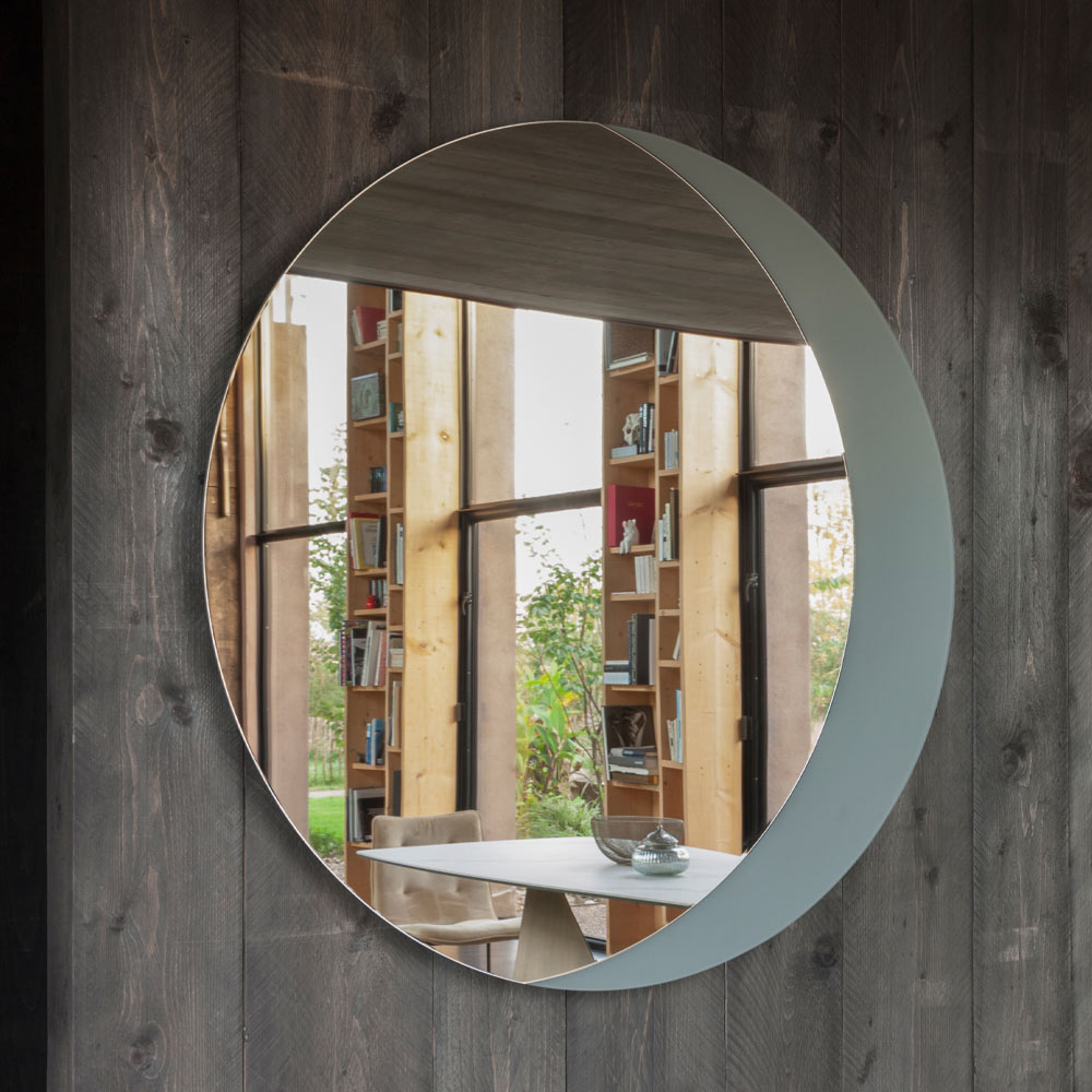 Espejo exclusivo que va más allá de la funcionalidad básica, transformándose en un elemento escultórico para el interior. Caracterizado por un detalle de media luna lacada, se puede combinar con muebles o aparadores, aportando un toque de elegancia a espacios domésticos modernos o tiendas glamurosas.