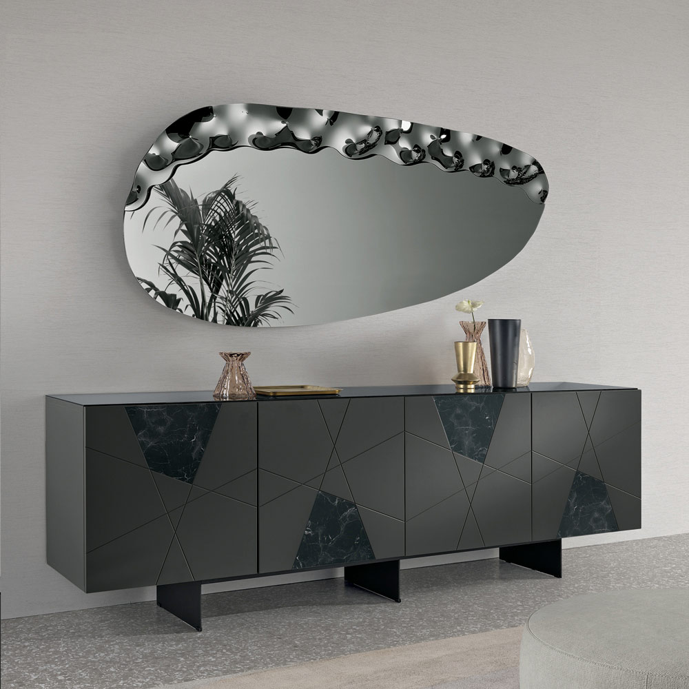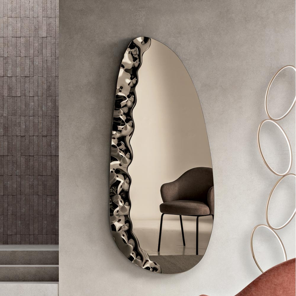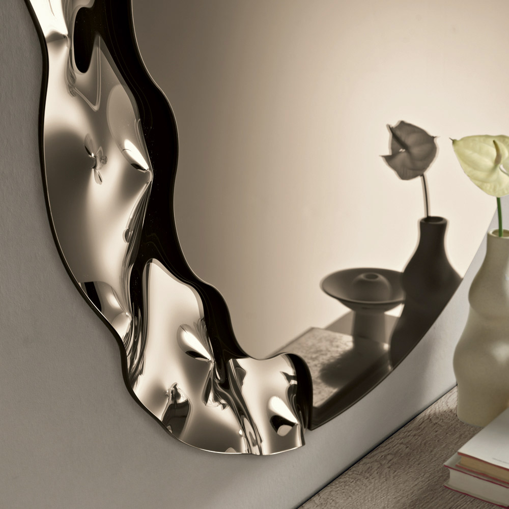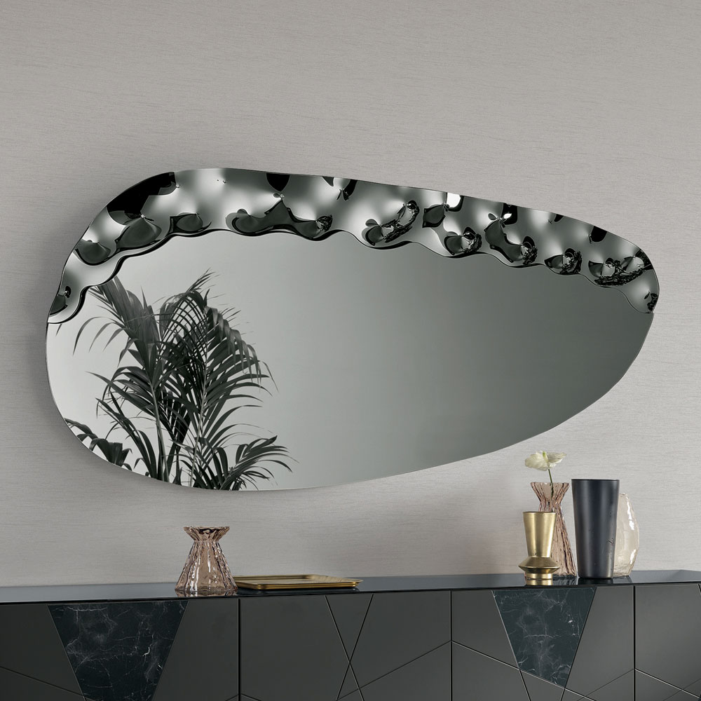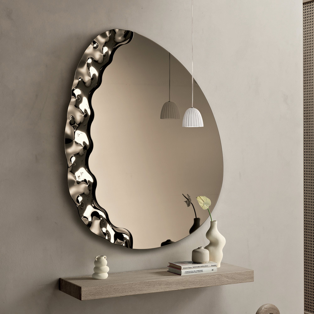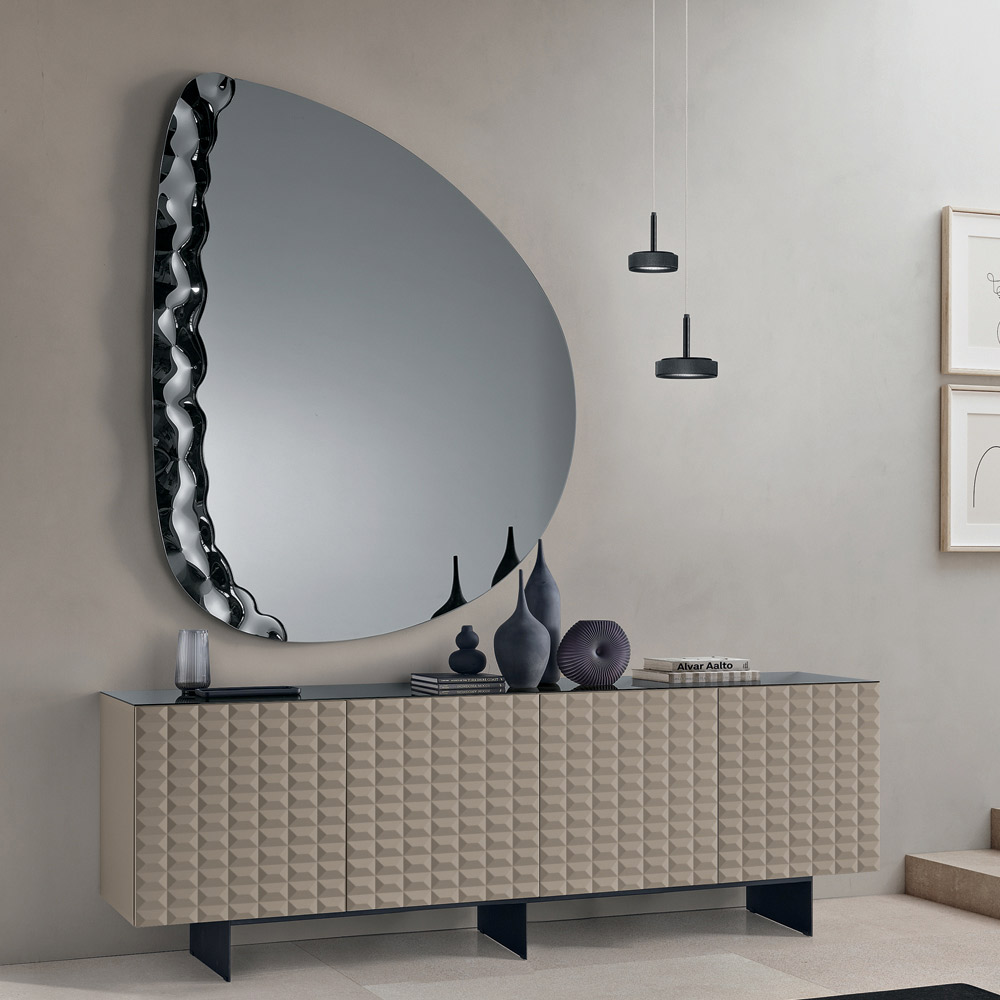 Un elegante espejo de pared diseñado en Italia , ideal para realzar espacios como la entrada , el salón o el dormitorio . Su diseño contemporáneo combina líneas suaves y detalles texturizados, transformando el espejo en un refinado elemento decorativo capaz de embellecer la pared con elegancia.