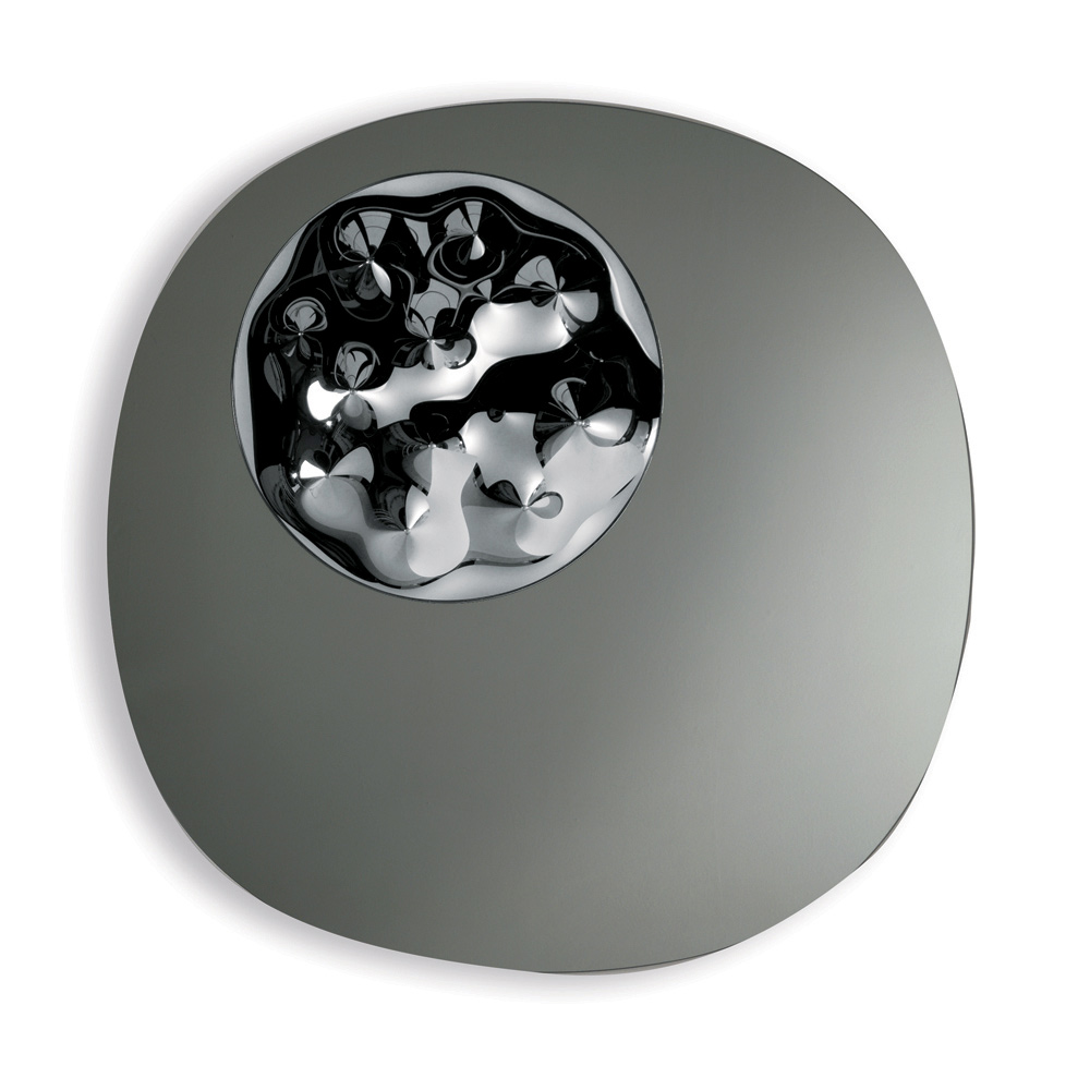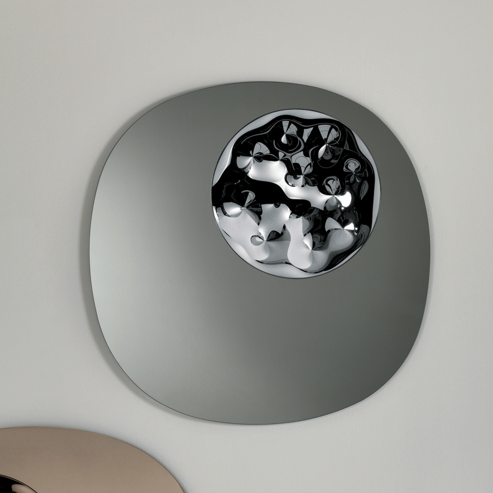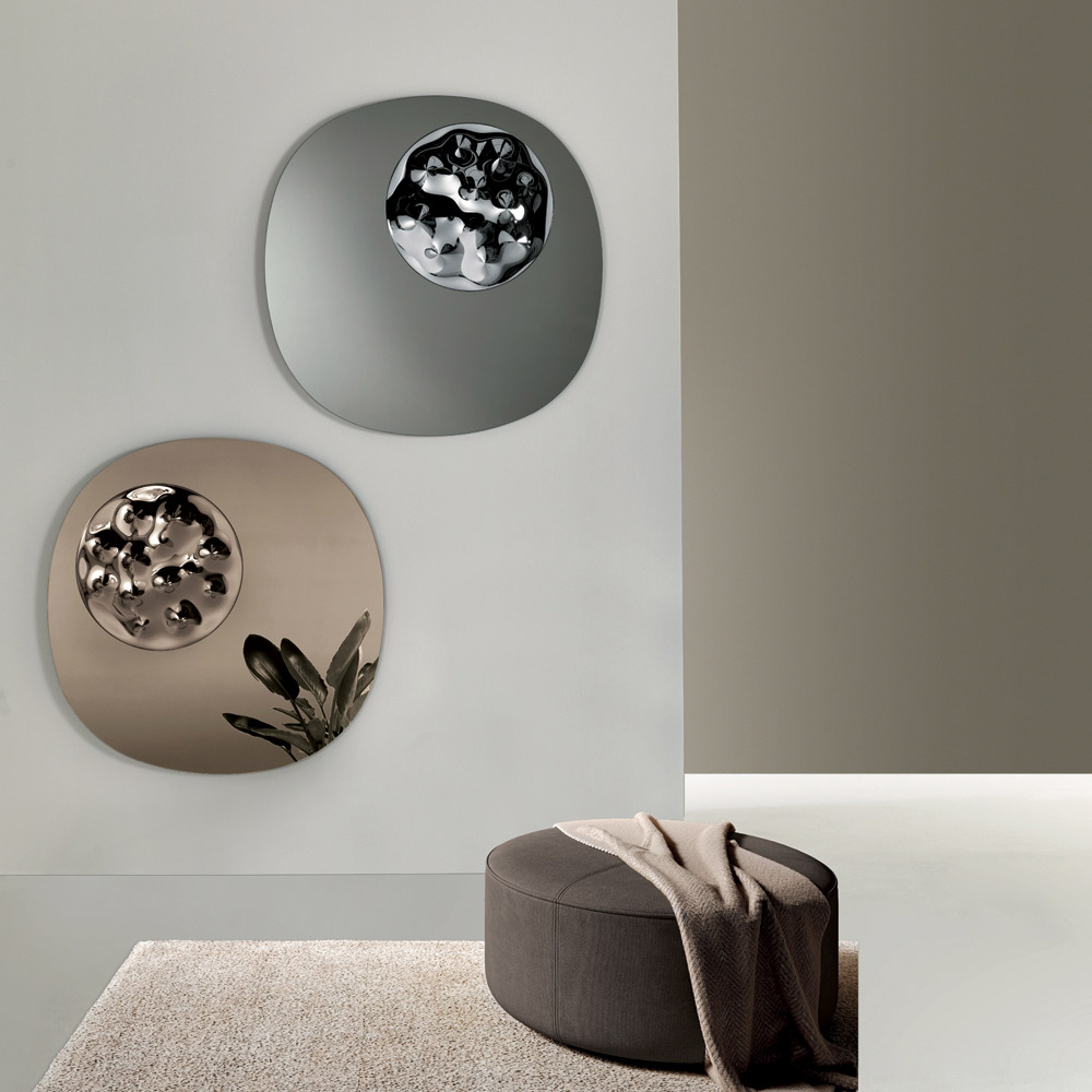 El diseño se realza con una distintiva inserción circular de cristal curvado tono sobre tono , situada en un lateral del marco. Este detalle crea un refinado juego de luces y reflejos que enriquece la superficie del espejo con un toque original y contemporáneo.