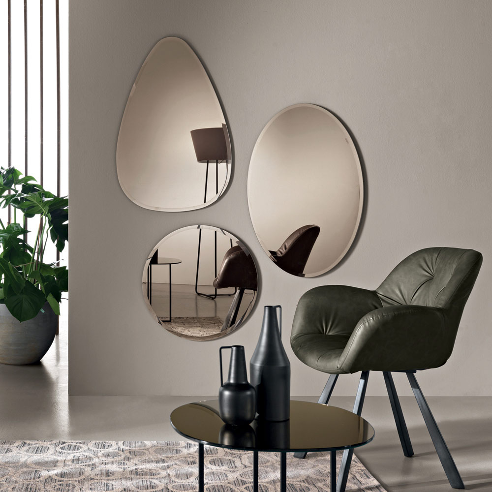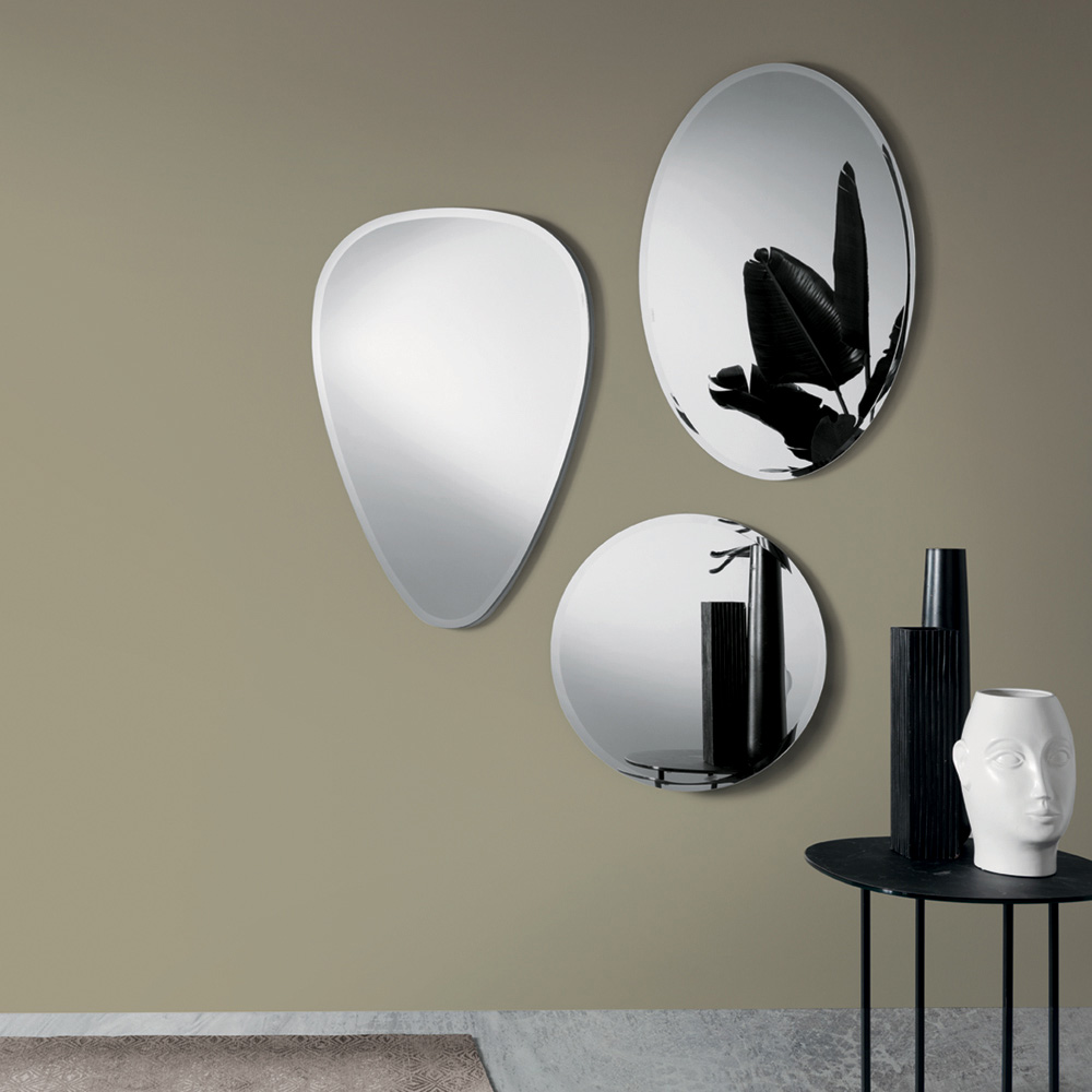 Cada elemento está adornado con un borde biselado que realza la silueta del espejo y potencia su luminosidad. Las tres formas se pueden combinar para crear una composición elegante y contemporánea, transformando la pared en una fusión de reflejos y geometrías decorativas.