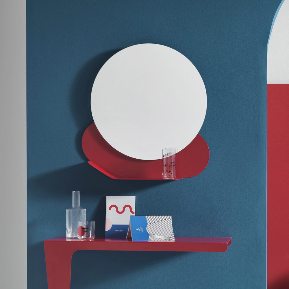 Este espejo de pared de diseño moderno encaja en contextos jóvenes gracias a la balda inferior en metal coloreado con colores vivos y contemporáneos, que delimita las formas redondas del espejo y crea continuidad con el entorno circundante. Un producto práctico y funcional con un diseño original y chispeante capaz de caracterizar diferentes contextos, desde la entrada al salón, así como en el baño o dormitorio.