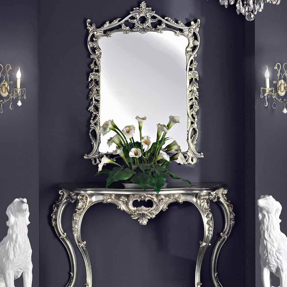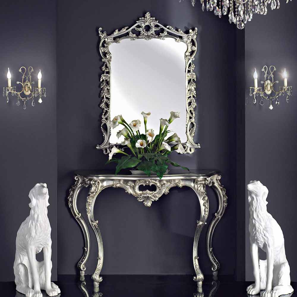Esplendor del diseño barroco italiano en este magnífico espejo con consola. Cada curva y friso ha sido esculpido por expertos para capturar la luz y encantar la mirada, transformando el espejo en una verdadera obra de arte. Sobre la consola, el espejo no sólo amplifica el espacio, sino que también refleja la belleza del entorno.