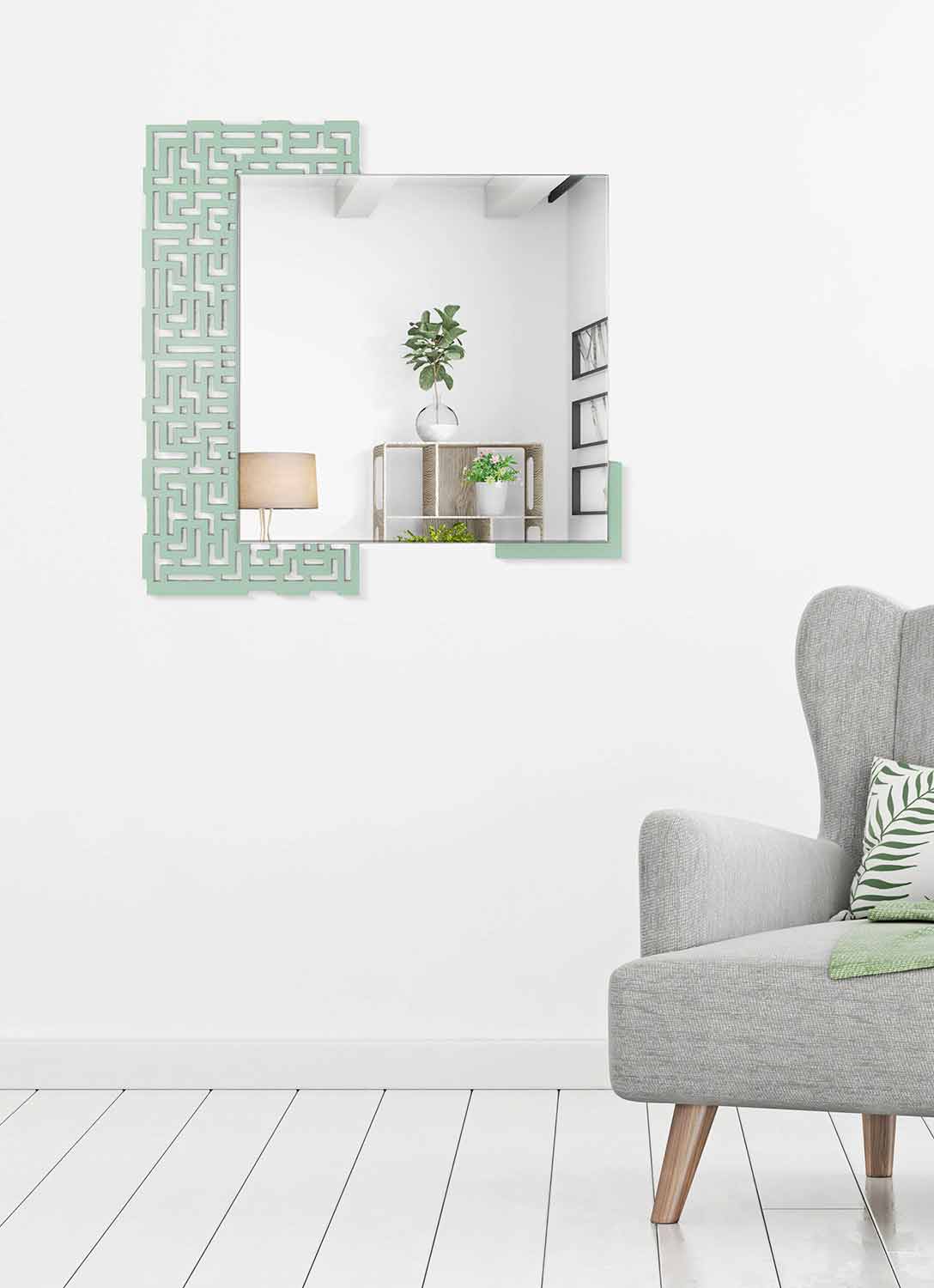 Espejo en madera lacada decorado con motivos geométricos . Ideal para ambientes modernos y jóvenes, decora dando un toque de color. También es adecuado para habitaciones más pequeñas como baños y entradas pequeñas.