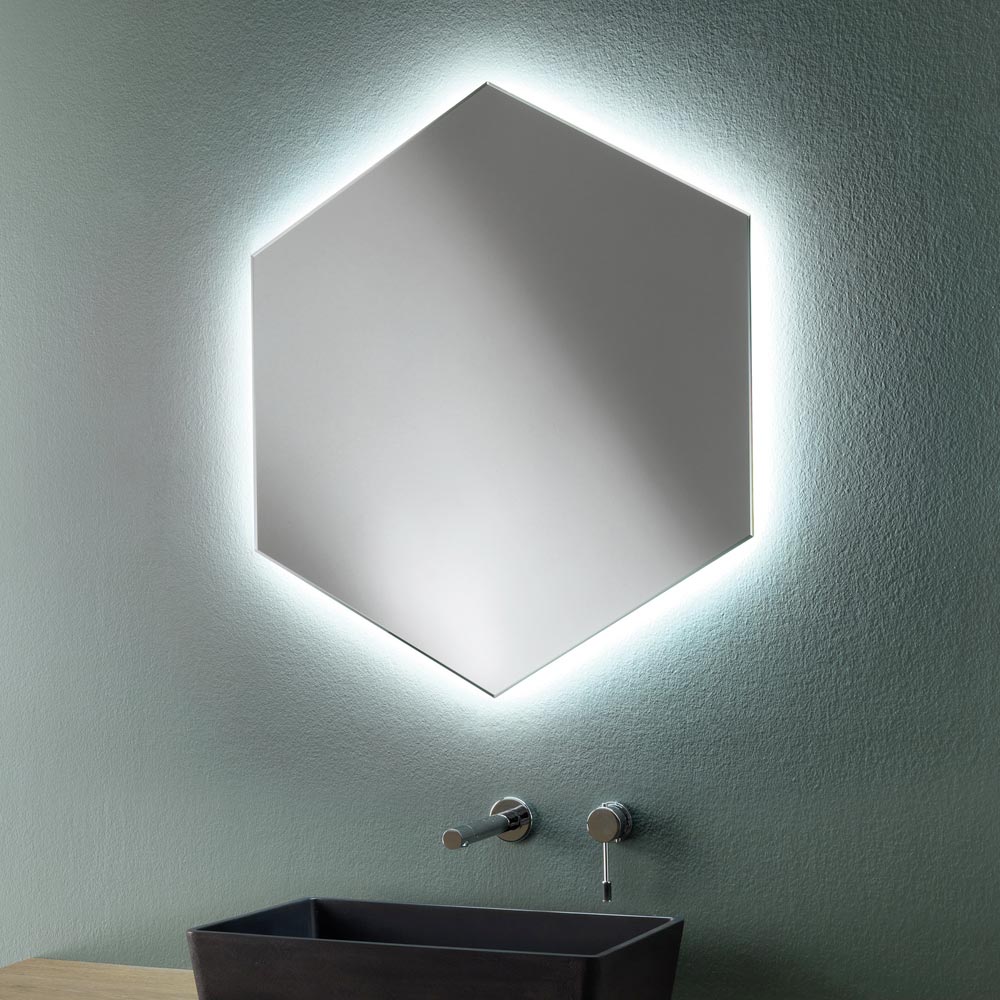 Espejo de pared para baño moderno de forma hexagonal con bordes biselados y retroiluminación LED, fabricado en Italia.