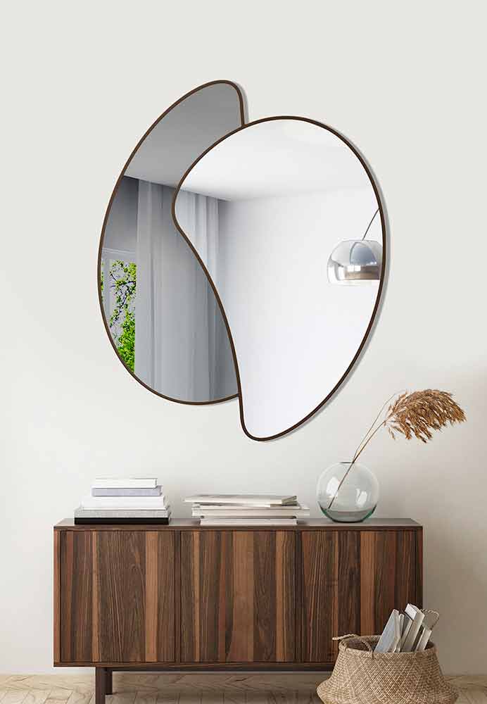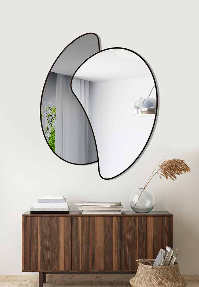 Este espejo de pared minimalista está compuesto por dos espejos, uno de los cuales es de color ahumado, con líneas elegantes y formas modernas combinadas con acabados lacados refinados para un resultado con un impacto estético minimalista y decorativo, en un estilo único.