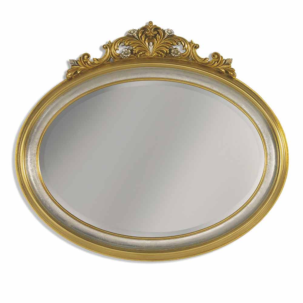 Su majestuoso diseño está rematado con un intrincado adorno que corona el espejo, añadiendo un punto de interés visual y una sensación de altura y grandeza a la pared de la que cuelga. La forma ovalada de la superficie reflectante ofrece una visión suave y acogedora, ideal para espacios donde se desea añadir una sensación de intimidad y refinamiento.