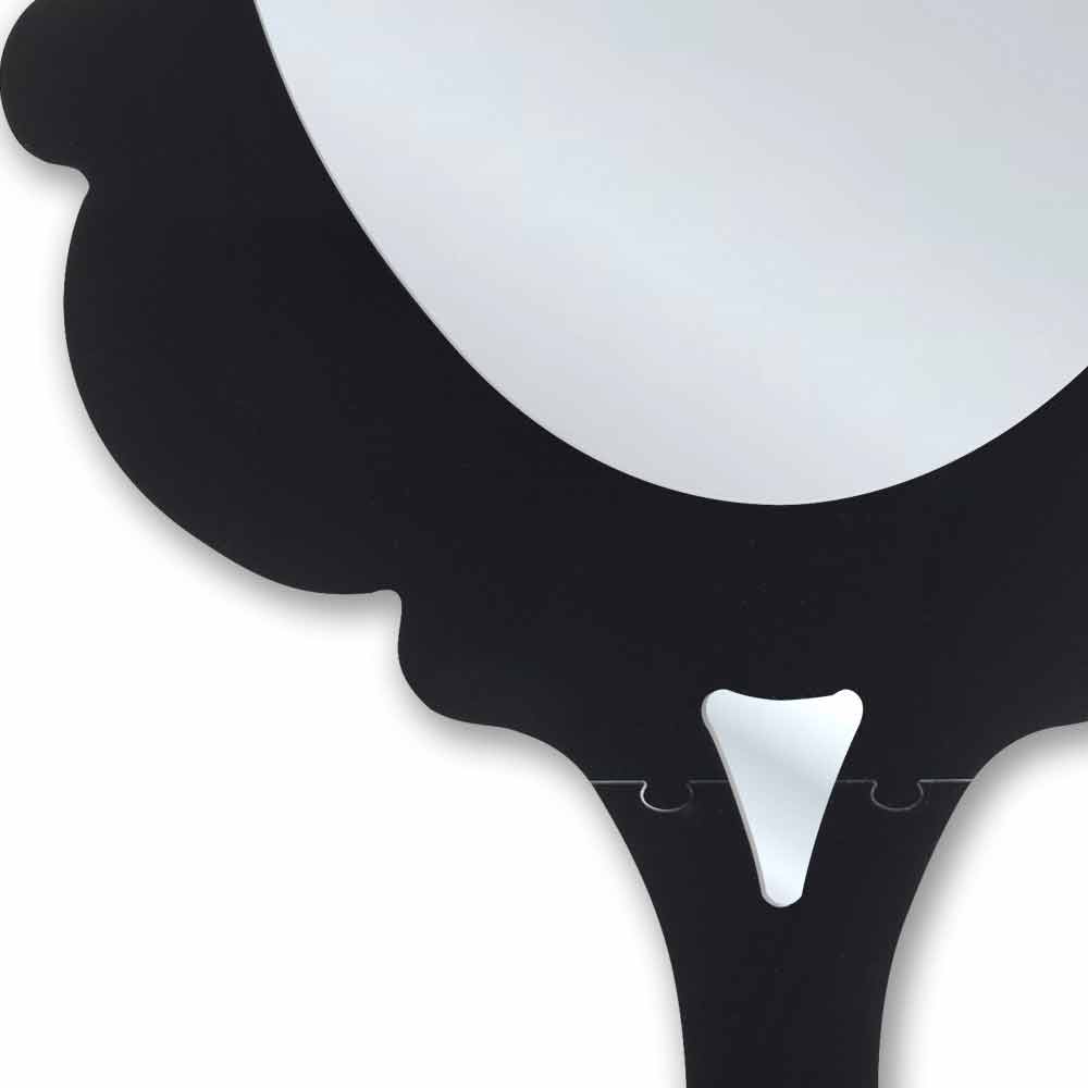 Espejo con un marco importante en plexiglás negro, en PMMA de polímero 100% virgen de la silueta de hadas de un espejo de bolso pequeño, pero del tamaño de un gran "espejo de mis deseos". El plexiglás es a prueba de golpes, indeformable, inalterable y aislante del calor. El brillo y el brillo permanecen constantes y sin cambios a lo largo del tiempo. El plexiglás de PMMA de polímero virgen utilizado es no tóxico, hipoalergénico, inodoro y antibacteriano. 100% reciclable. Diseñado, diseñado y fabricado en Italia, con materiales italianos.