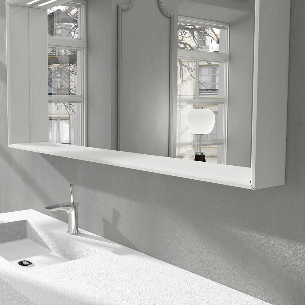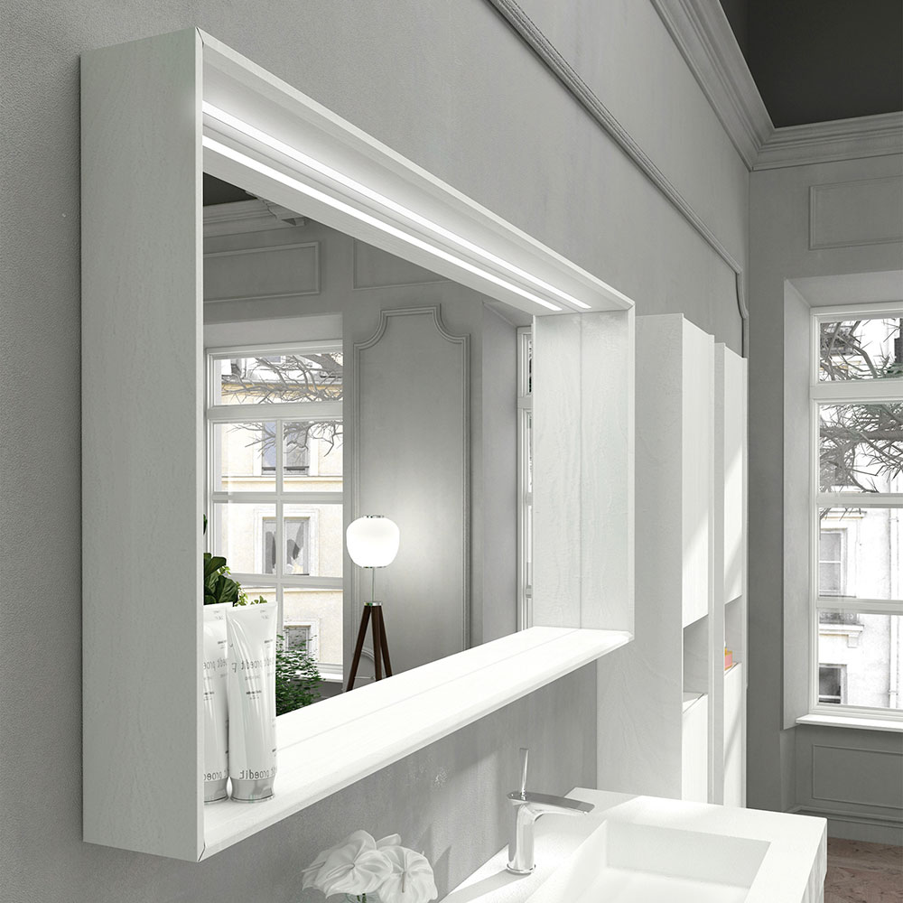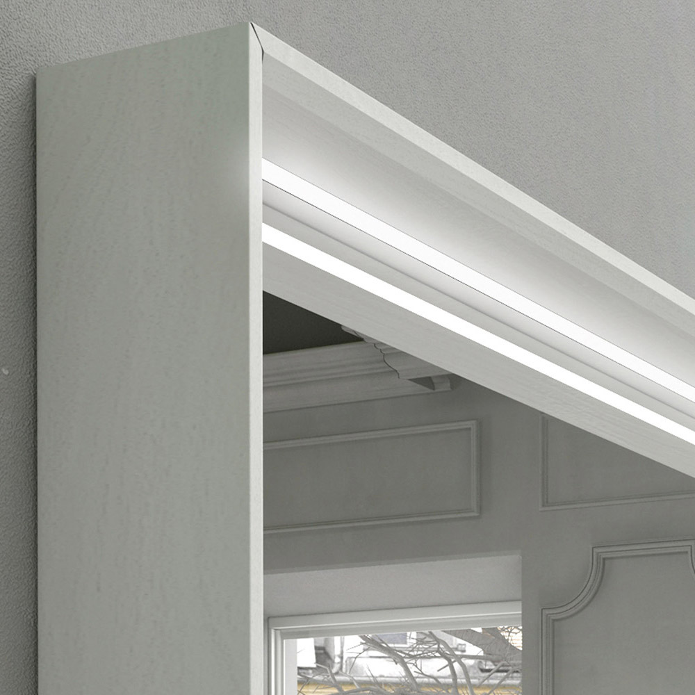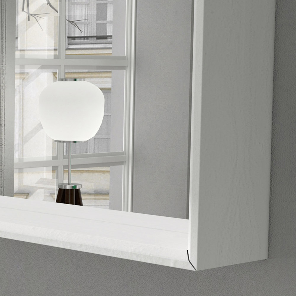 Este espejo de pared de diseño rectangular disponible en dos tamaños se caracteriza por su elegante marco en forma de caja en madera lacada en blanco mate que le da un aspecto moderno y original. Cuenta con iluminación superior LED integrada para un diseño funcional y práctico.