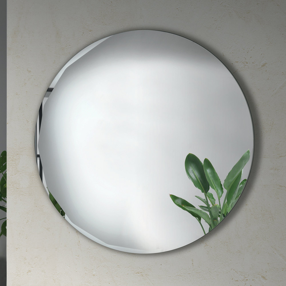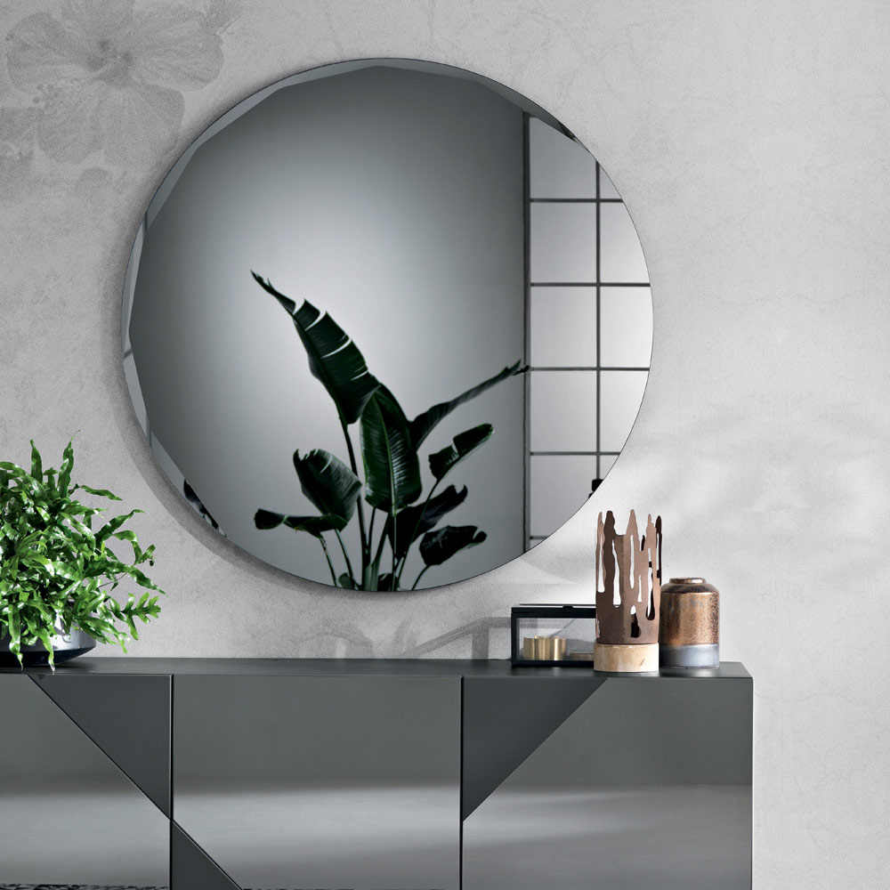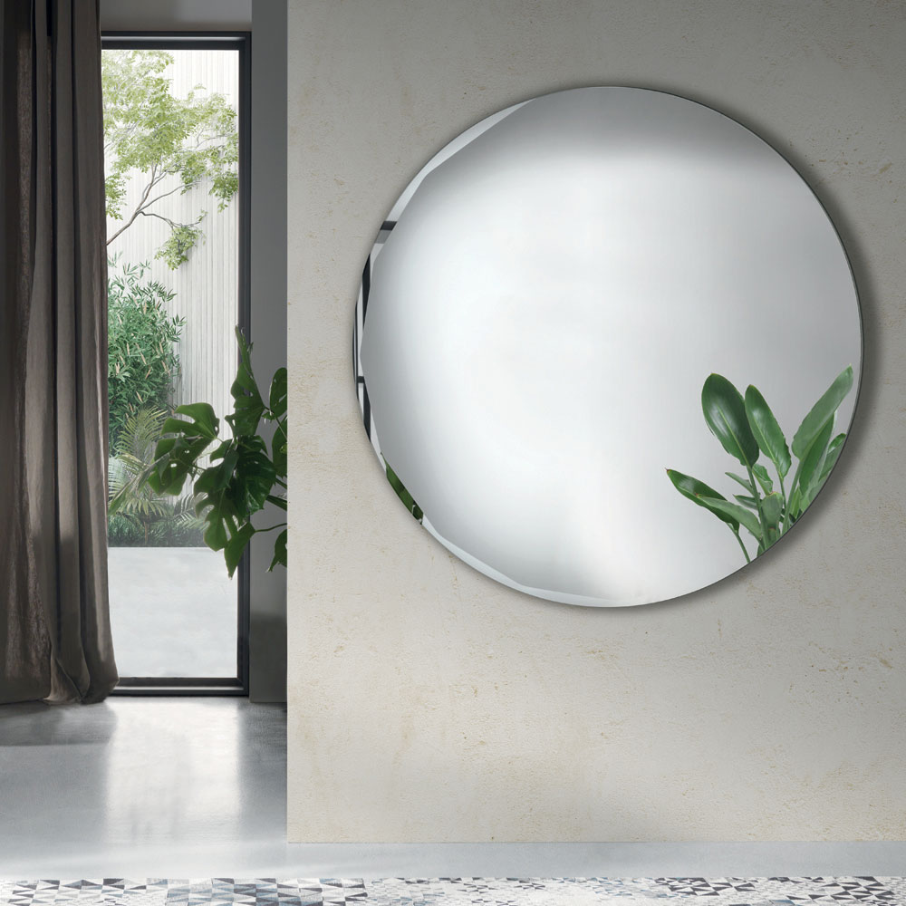 El espejo presenta una forma redonda pura, adornada con un refinado bisel lateral que realza su perfil y su diseño minimalista. Este detalle crea un delicado juego de reflejos en el borde, aportando profundidad y luminosidad a la superficie.