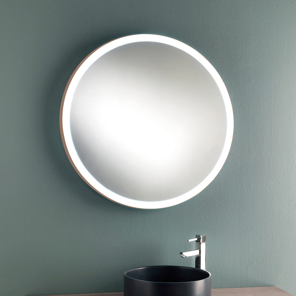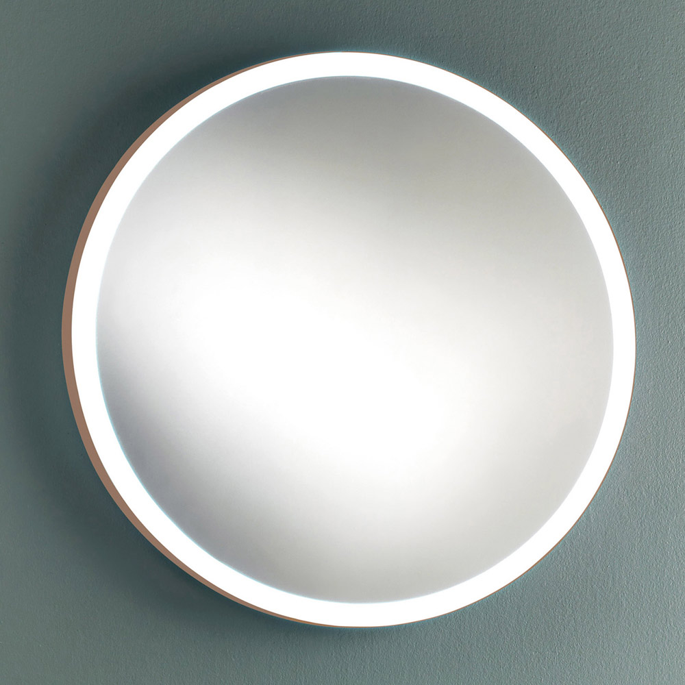 Espejo de pared redondo con estructura de metal cobre e iluminación led, fabricado en Italia.