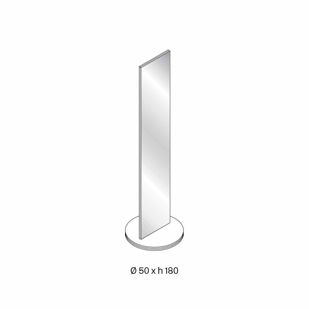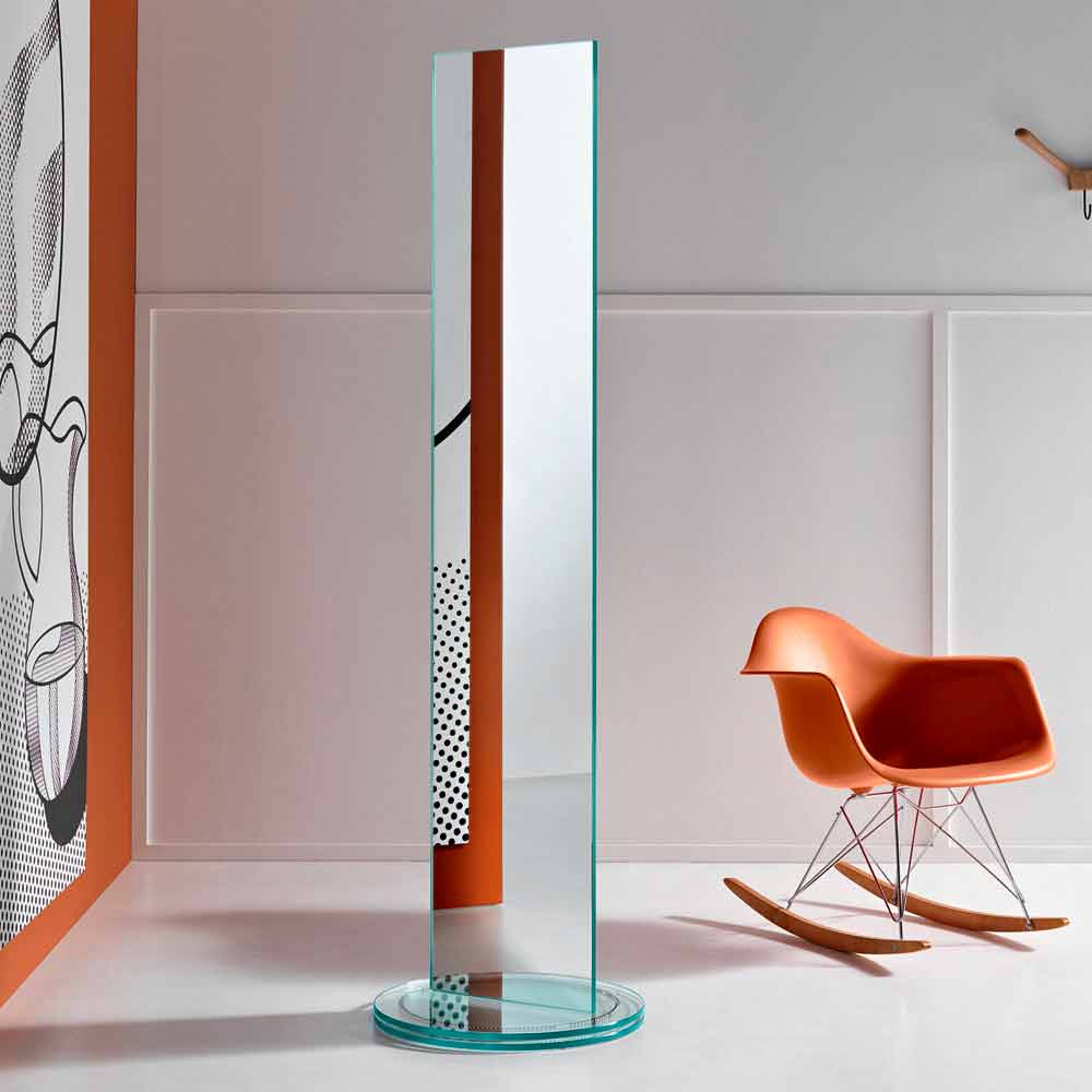 Este espejo de pie se caracteriza por su diseño escultórico realizado íntegramente en espejo de doble cara con base giratoria en vidrio templado.