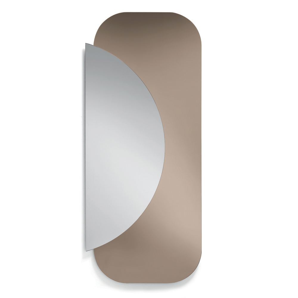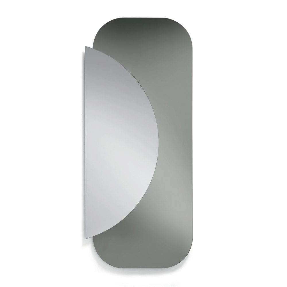 La composición se compone de dos placas superpuestas : una base rectangular de esquinas suaves y un semicírculo de espejo natural que se superpone, creando un elegante diálogo entre geometría y reflejos. Este contraste entre formas y materiales genera un efecto visual dinámico y contemporáneo.