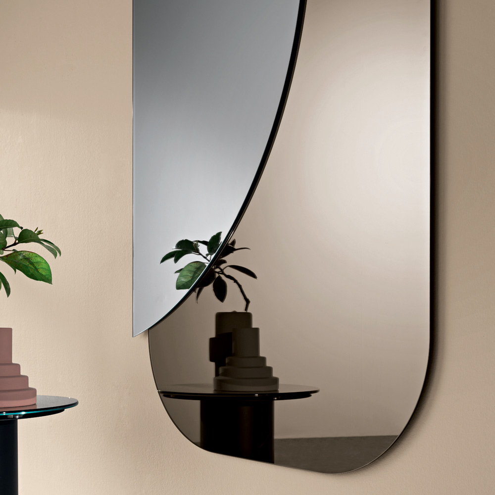 Un elegante espejo de diseño italiano , ideal para realzar con estilo espacios como la entrada , el salón o el dormitorio . Su diseño moderno se distingue por un refinado juego de formas superpuestas que aporta profundidad y carácter a la pared.