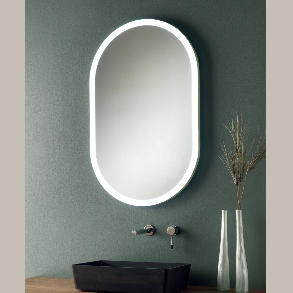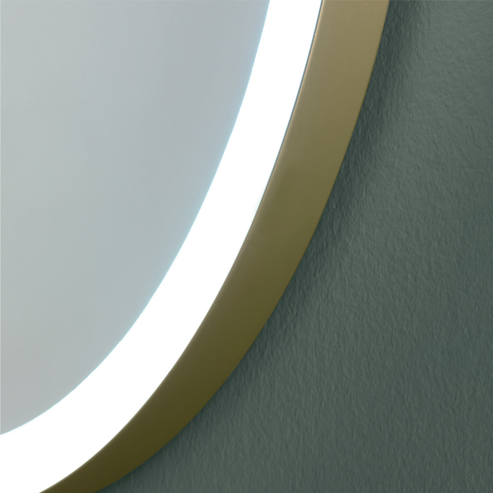 El perfil ovalado está definido por un marco metálico que abraza delicadamente el espejo, mientras que el perímetro está iluminado por un anillo de luz LED que proyecta un brillo uniforme y acogedor. Este detalle no sólo mejora la visibilidad sino que también agrega una atmósfera de calidez y profundidad a los espacios, haciendo que este espejo sea perfecto para el dormitorio, el baño o como una pieza acogedora en la entrada de tu hogar.