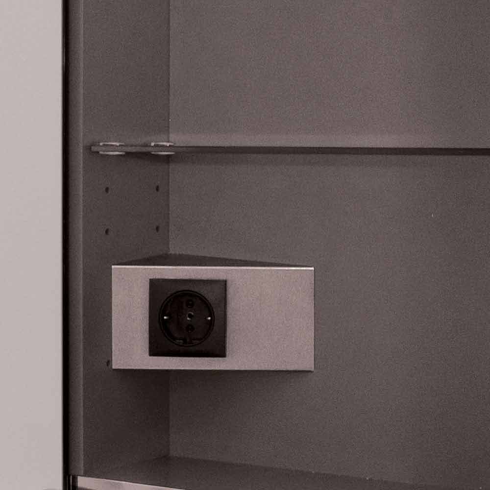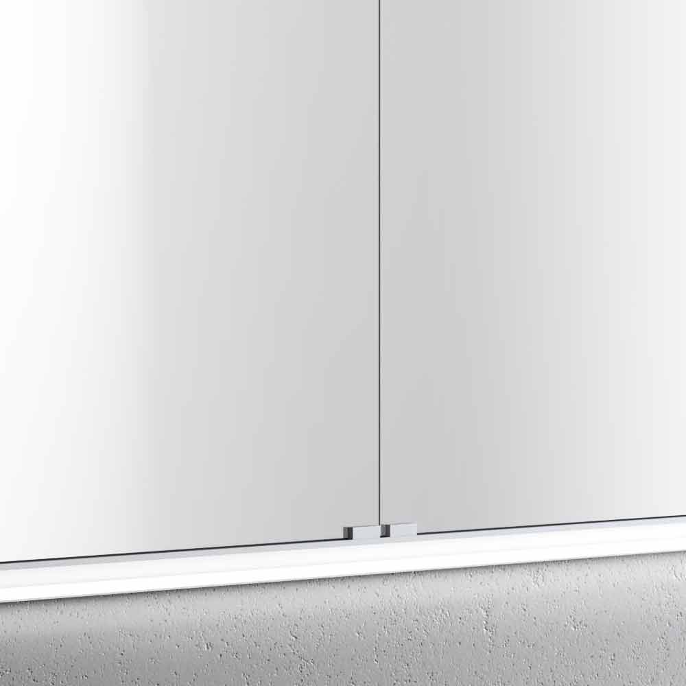 Armario con 2 puertas de espejo con líneas puras donde la iluminación se convierte en un elemento de diseño. Estructura FENIX, material polimérico con nano tratamiento tecnológico, repelente al agua, anti-huella digital y suave al tacto. Se suministra con zócalo y el interruptor.