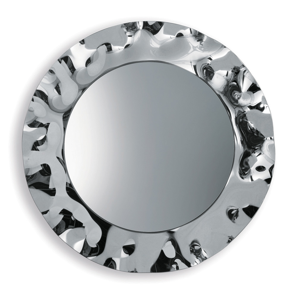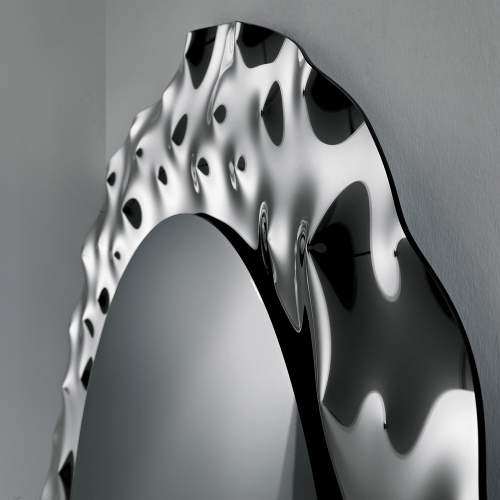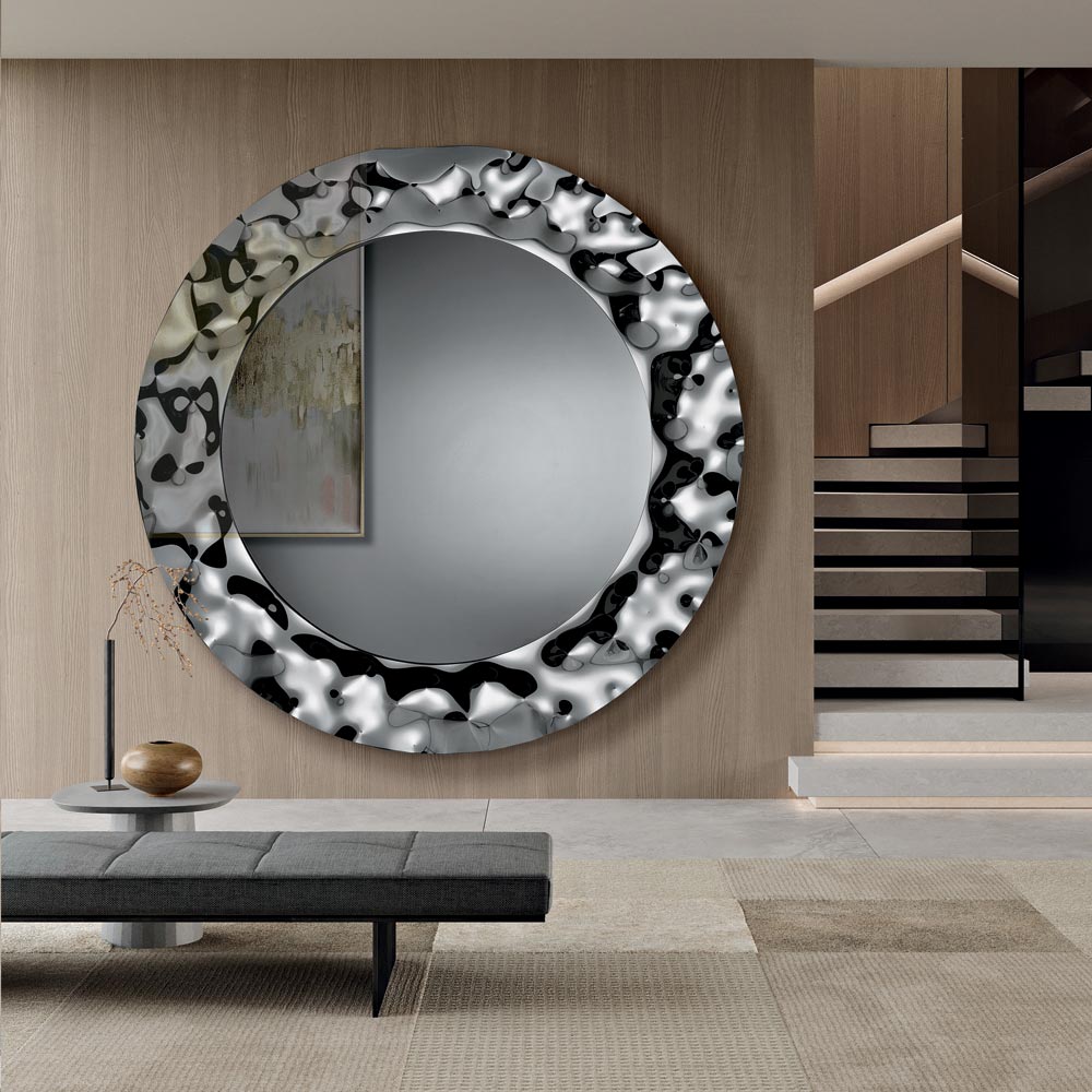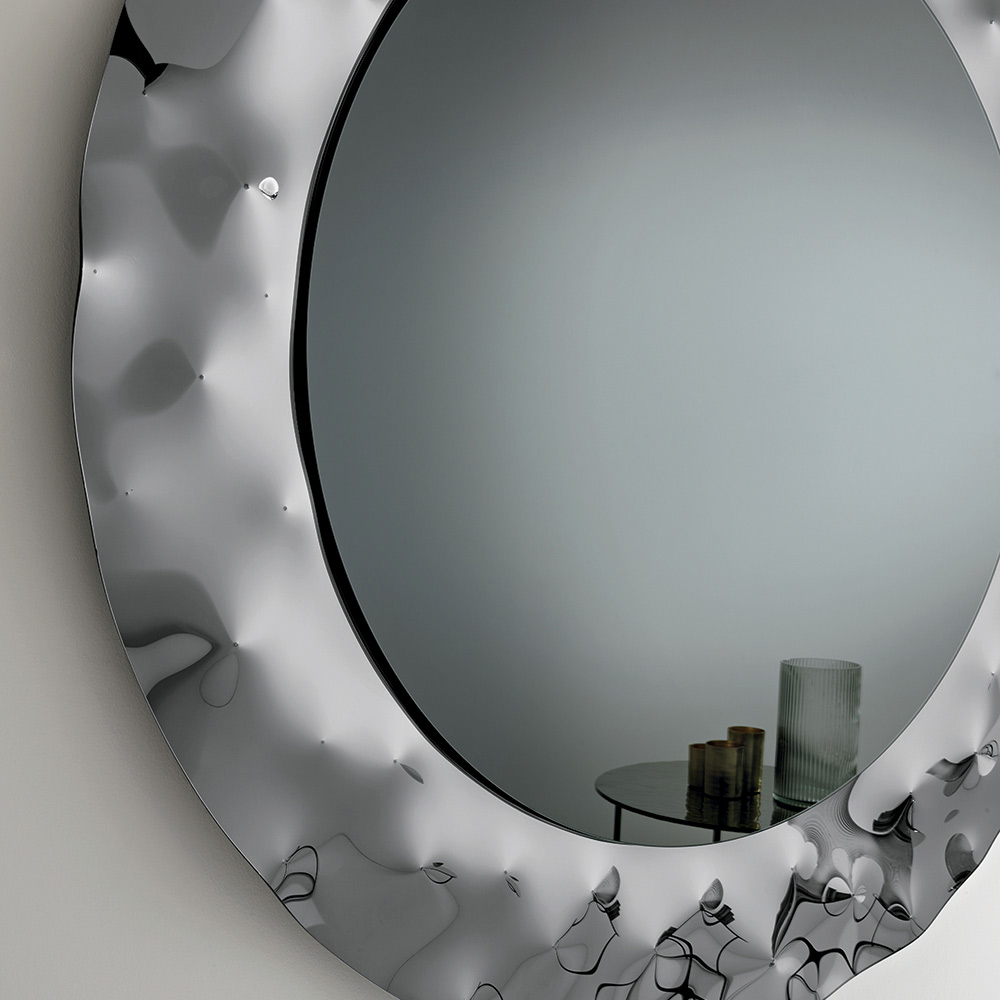 La superficie reflectante está adornada con un marco de cristal curvado tono sobre tono que recorre el borde del espejo, creando un elegante juego de luces y texturas. El exclusivo acabado del cristal aporta profundidad y dinamismo a la composición, realzando el aspecto contemporáneo de la pieza.
