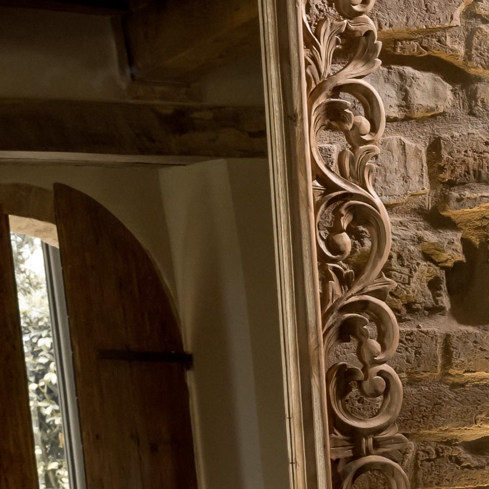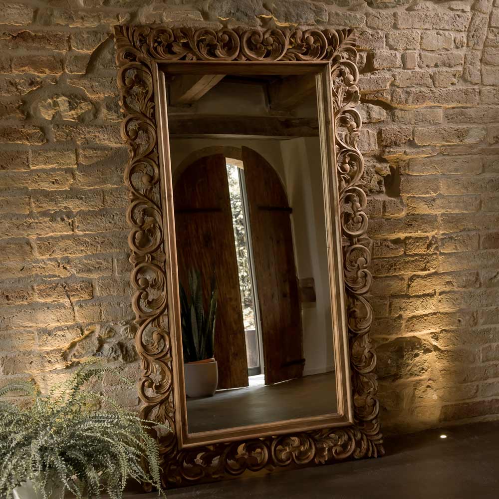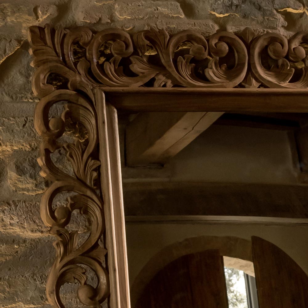 Este espejo de madera maciza tallada es un encantador elemento decorativo, capaz de realzar cualquier espacio con elegancia y personalidad. Su marco, elaborado artesanalmente , le confiere un carácter único y atemporal.