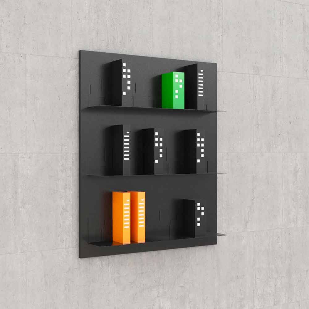 Una biblioteca en hierro pintado que no se limita a ser un contenedor de libros, pero un mueble decorativo real. Como un cuadro en la pared, Skyline reproduce el perfil de una metrópoli moderna: rascacielos dividen las tres cimas y doblan como sujetalibros originales. Una original y funcional para decorar el hogar o la oficina. Diseño: Antonio Farina