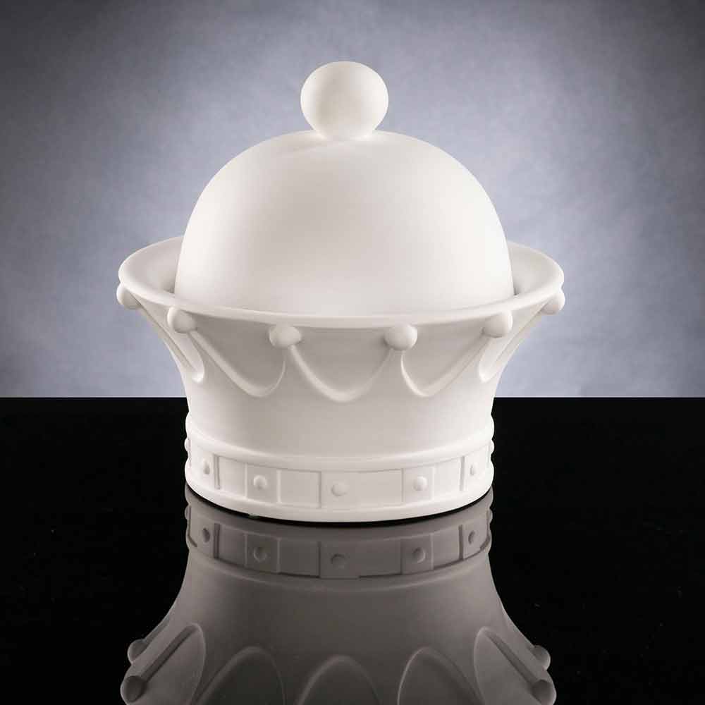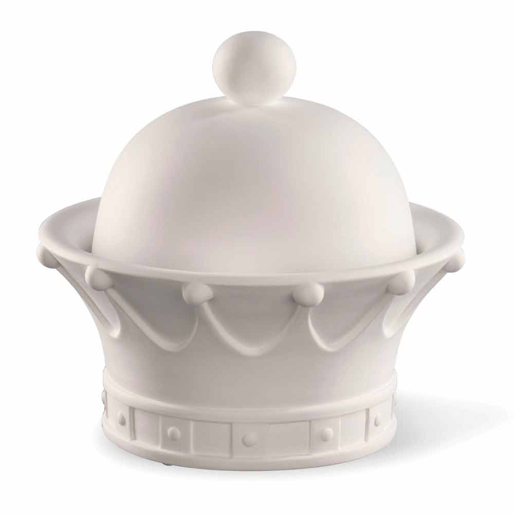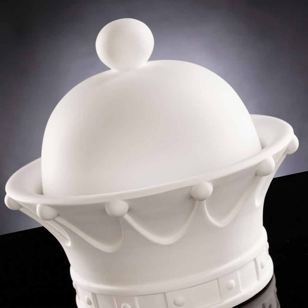 Adorno decorativo en forma de corona de reina que se abre, hecho a mano en Italia en cerámica blanca . Un adorno excéntrico y elegante al mismo tiempo capaz de completar el mobiliario circundante creando una maravillosa armonía que encarna la modernidad y el diseño . Su forma original y creativa es ideal para quienes aman enriquecer sus espacios domésticos con elementos caracterizados por un alma original y única a la vez que ofrecen un pequeño espacio en el que abarrotar y organizar algunos objetos gracias al práctico compartimento colocado debajo de la tapa.