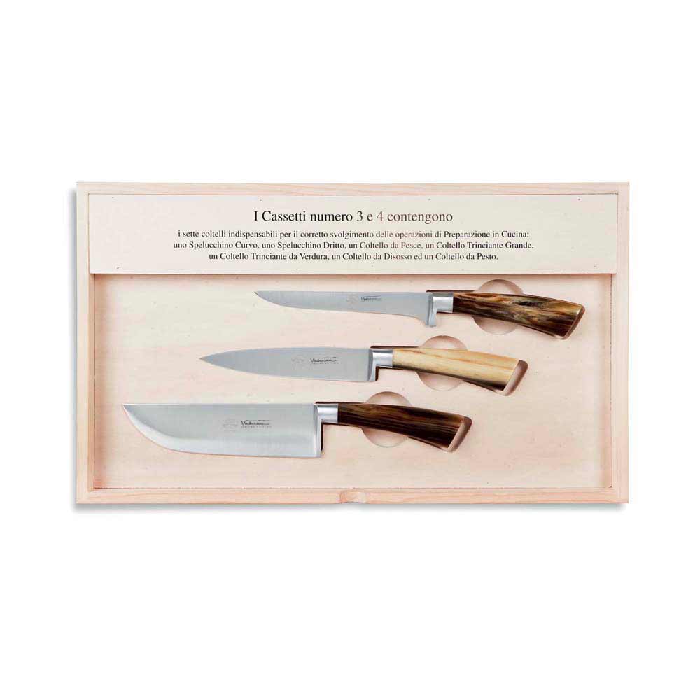 Las hojas se obtienen mediante forja encaliente con un mazo, antaño única forma de garantizar una buena calidad de corte (los golpes de martillo rompen y ordenan las moléculas del acero) hoy en día son muy apreciadas por su bello y elegante aspecto. Fabricadas con un mango macizo, es decir, la hoja tiene la espiga oculta en el interior del mango, tienen el acabado superficial de la hoja satinada. Elaborado íntegramente a mano en pequeñas cantidades . El tratamiento térmico también incluye subenfriamiento a -80 ° C para garantizar la máxima capacidad de corte y duración.