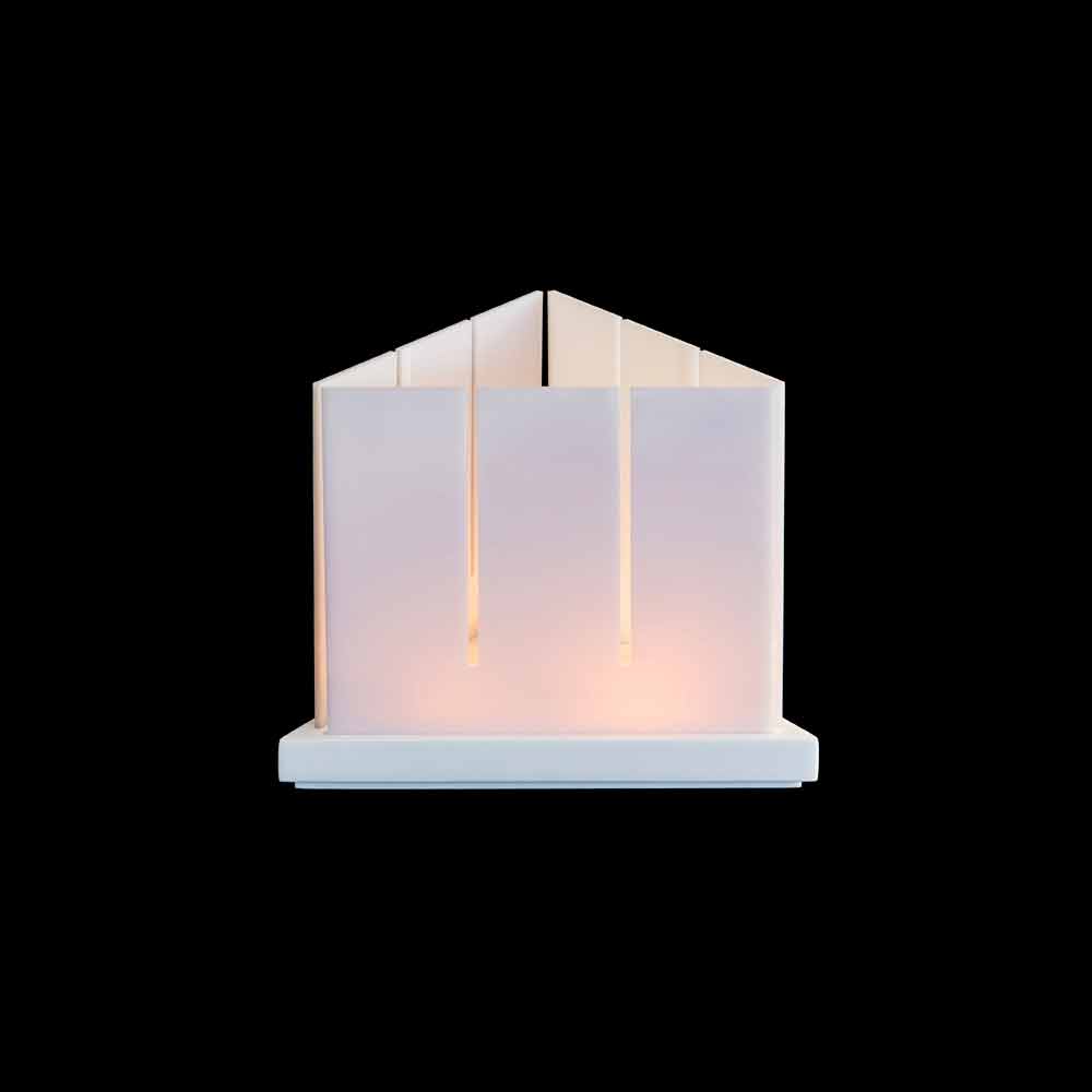 Se trata de un farol de base triangular para tres luces con tres pantallas “opal” extraíbles y cortaviento para un juego de luces elegante y esencial.