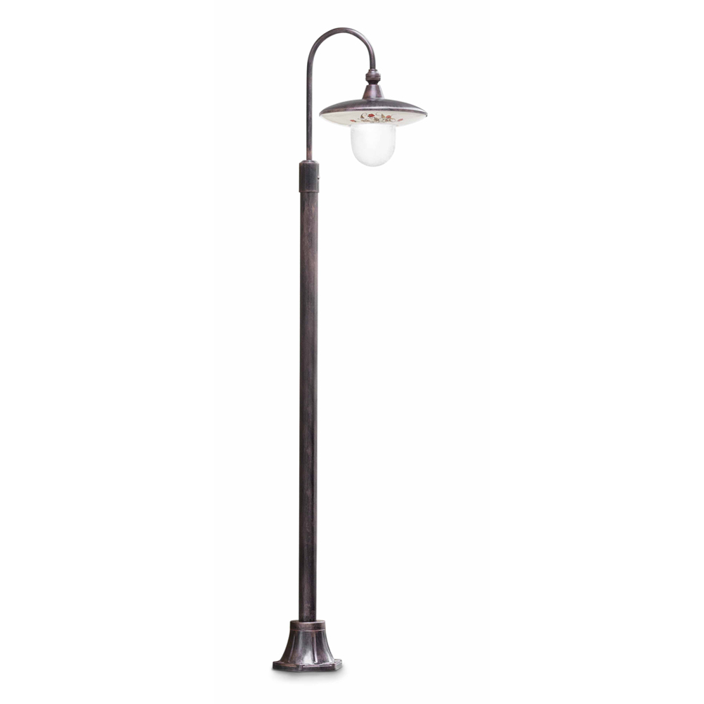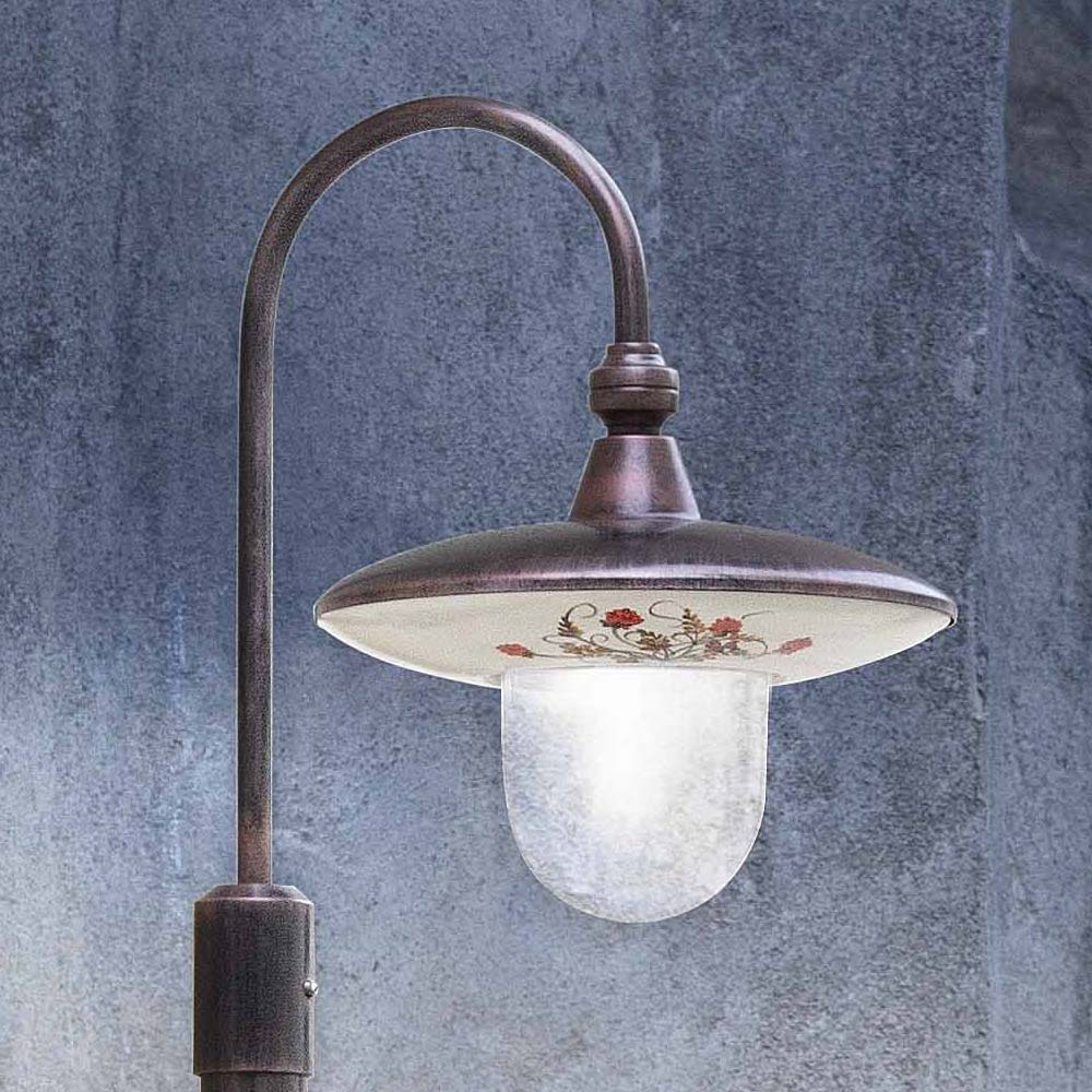 Esta lámpara de jardín está hecha completamente de aluminio negro con pantalla de cobre y decorada con flores pintadas a mano para un estilo clásico y armonioso entre formas y colores.