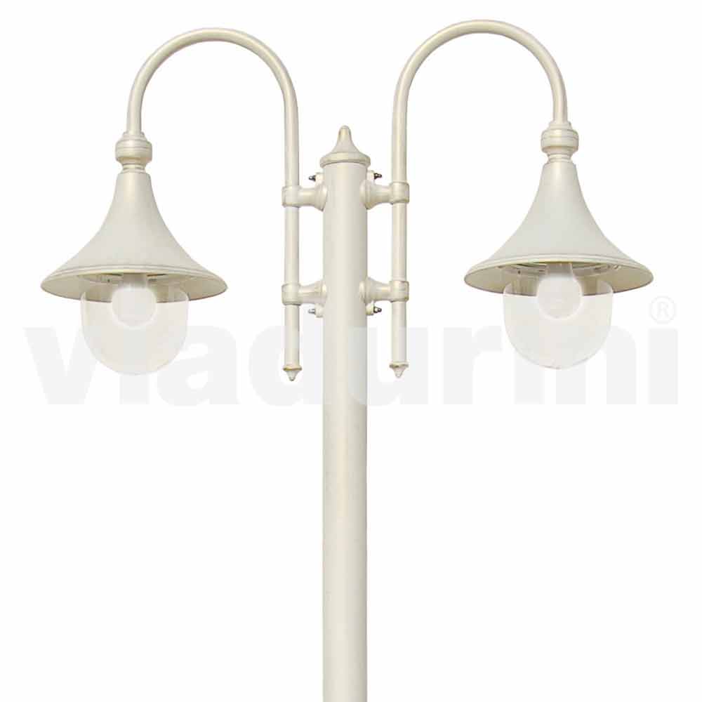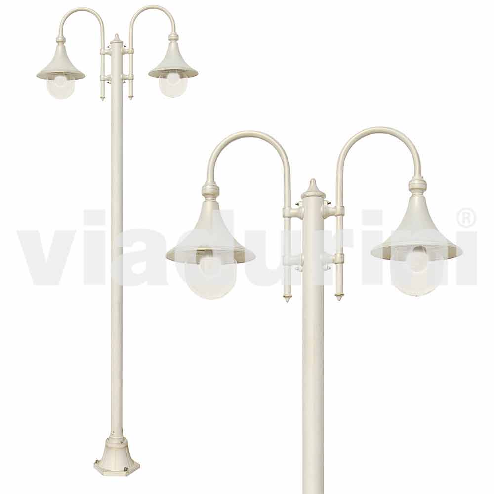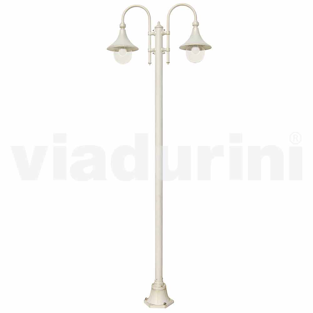 Lámpara de jardín de dos luces en aluminio blanco fabricada en Italia, Anusca Anusca es una majestuosa farola de exterior de dos luces hecha a mano en Italia con materiales de alta calidad: estructura de aluminio inyectado y difusor de policarbonato disponible en las siguientes variantes: transparente (garantiza una difusión de luz óptima y siempre homogénea); ópalo y ahumado.