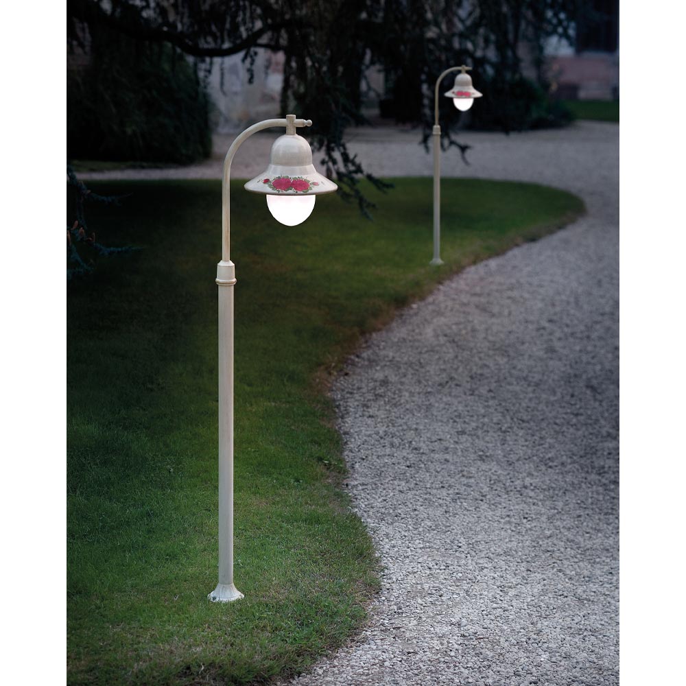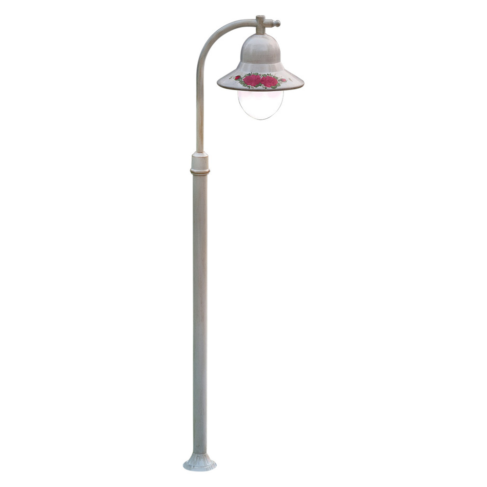Esta farola de exterior está realizada íntegramente en aluminio blanco matizado y decorada con flores pintadas a mano para un estilo clásico y armonioso entre formas y colores.