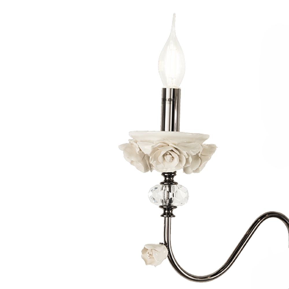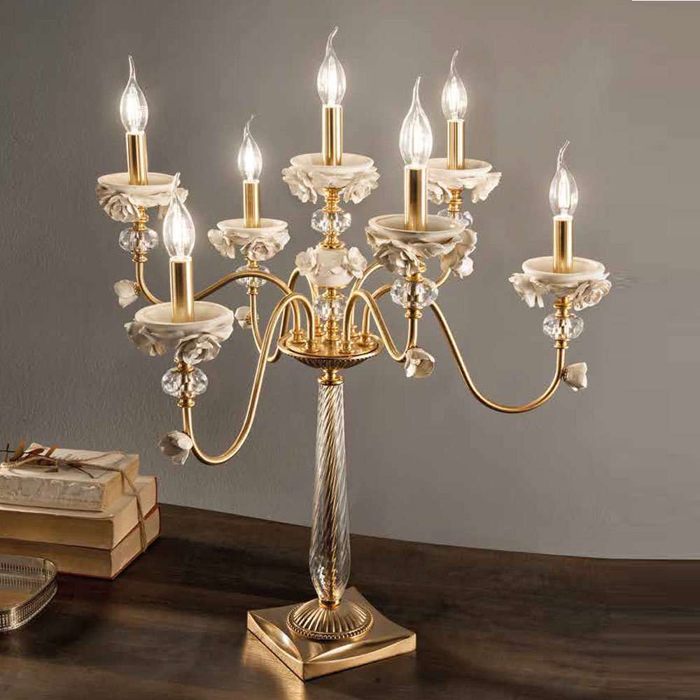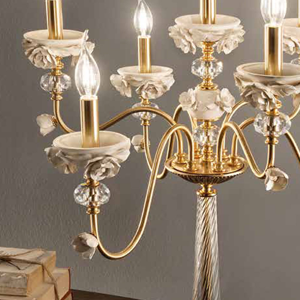 Lámpara flambeaux de 7 luces en porcelana y vidrio soplado, lujo made in Italy.