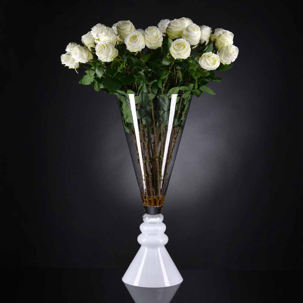 Jarrón de interior en vidrio transparente con base blanca elaborado con un procesamiento 100% Made in Italy . Un complemento caracterizado por una estética simple y limpia subrayada por una elegancia extrema y unos acabados versátiles que permiten su uso en cualquier ambiente con un estilo refinado . Un diseño ideal para los más variados ambientes, desde el mobiliario del hogar hasta el de hoteles, restaurantes, espacios contract, spas pero también como escenario para eventos y bodas.