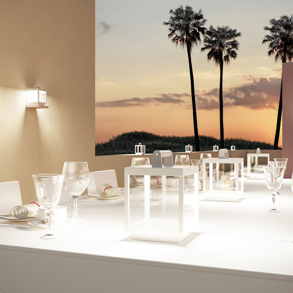 Gracias a su conformación es perfecta tanto como lámpara de soporte en combinación con varios elementos, como como lámpara de suspensión mediante el uso del gancho colocado en la parte superior. El resultado es un complemento de alta calidad capaz de resaltar áreas exteriores dentro de ambientes domésticos o contract.