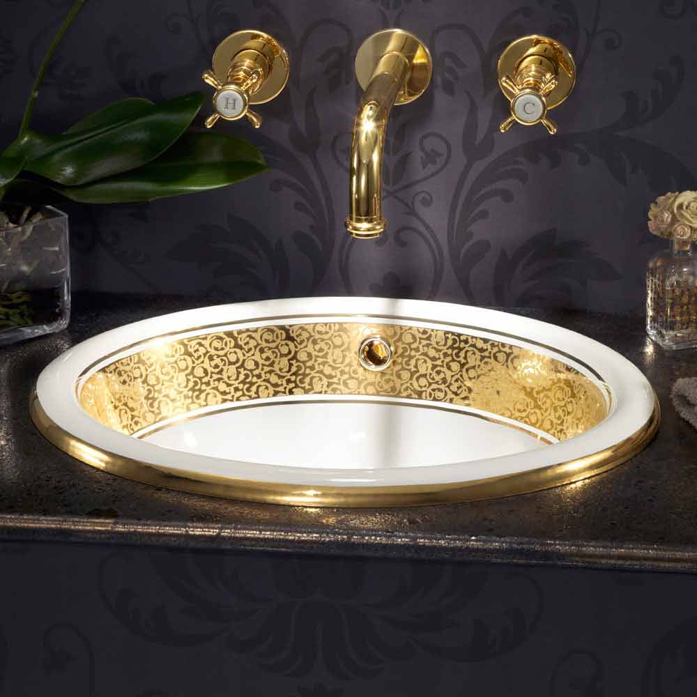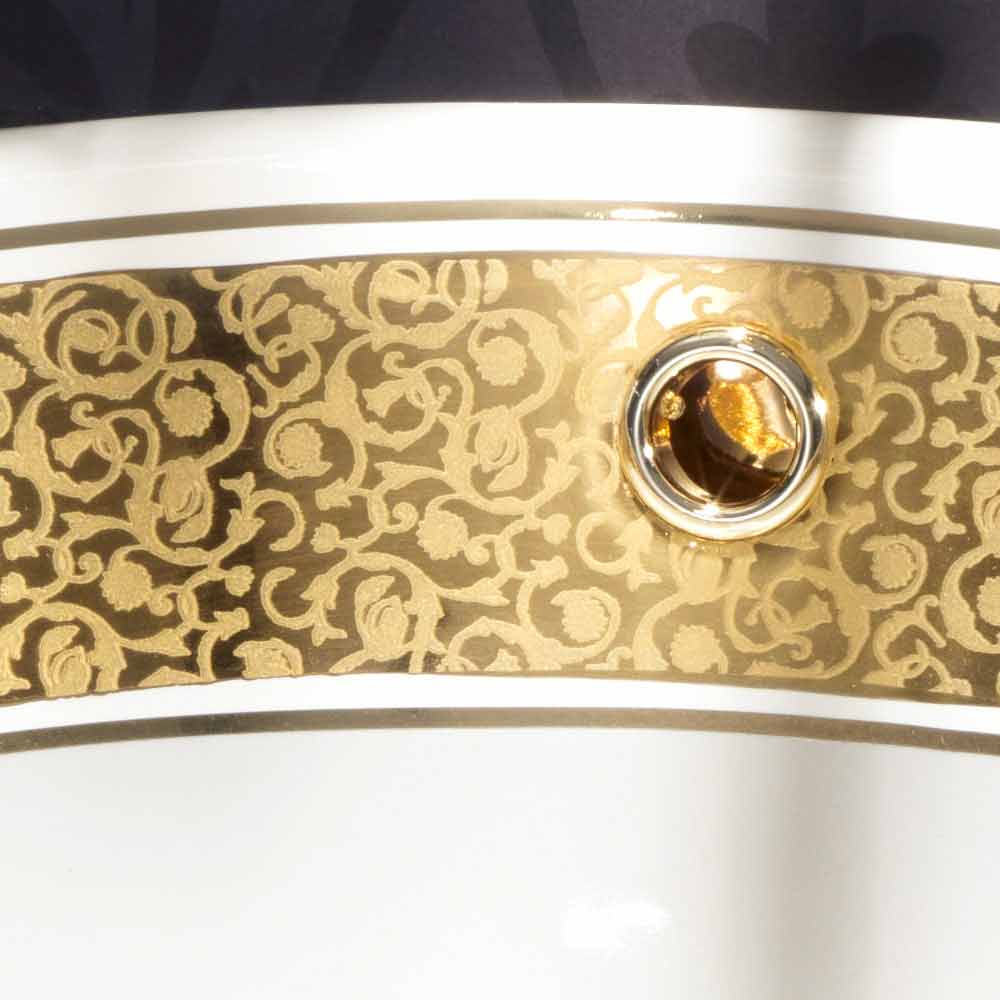 Lavabo incorporado en el baño hecho en Italia hecho a mano en arcilla de fuego, decorado con una franja dorada en relieve, dos trenzas y un borde de oro de 24k.