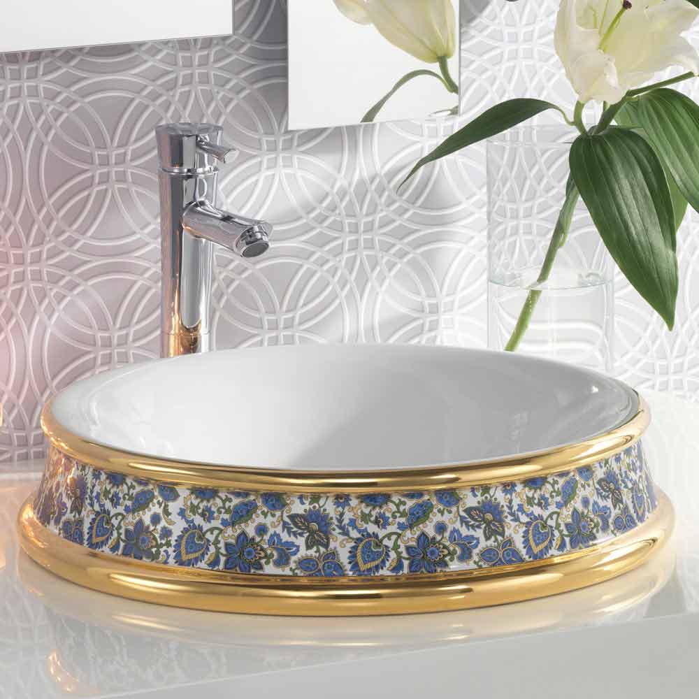 Fregadero semirecesado para baño hecho en Italia en arcilla de fuego, hecho a mano, con rayas con una decoración floral azul y dorada y anillos pintados en oro de 24k.