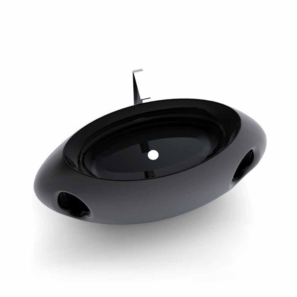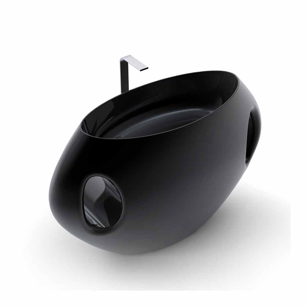 lavabo escenográfico de Solid Surface; de pie, con formas inspiradas en los grandes jarrones clásicos. Se caracteriza por líneas de geometría elíptica, anchas y alargadas, que marcan el complemento. Sus formas generosas y las dos elipses en forma de "asas" muestran un perfil que recuerda la forma de un gran jarrón. Su nombre "Pandora", de hecho, hace referencia a la más famosa de las vasijas antiguas pertenecientes al mundo de la mitología griega, la mítica caja de Pandora. Sus características, además del perfil vasiforme "estirado" en anchura, también un cómodo y amplio lavabo de corte horizontal y dos ranuras decorativas elípticas en los frentes, que lo cruzan de lado a lado, sirviendo también de toallero. El sanitario tiene una buena ergonomía, ya que es abundantemente redondeado, disponible en dos variantes de color: Blanco (RAL9003) o Negro (RAL9005)