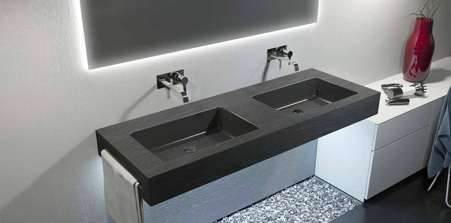 Rufina es un sistema integrado compuesto por una tapa de material que alberga los dos lavabos; Su peculiaridad es que puede instalarse en cualquier tipo de base o dejarse en la versión suspendida.