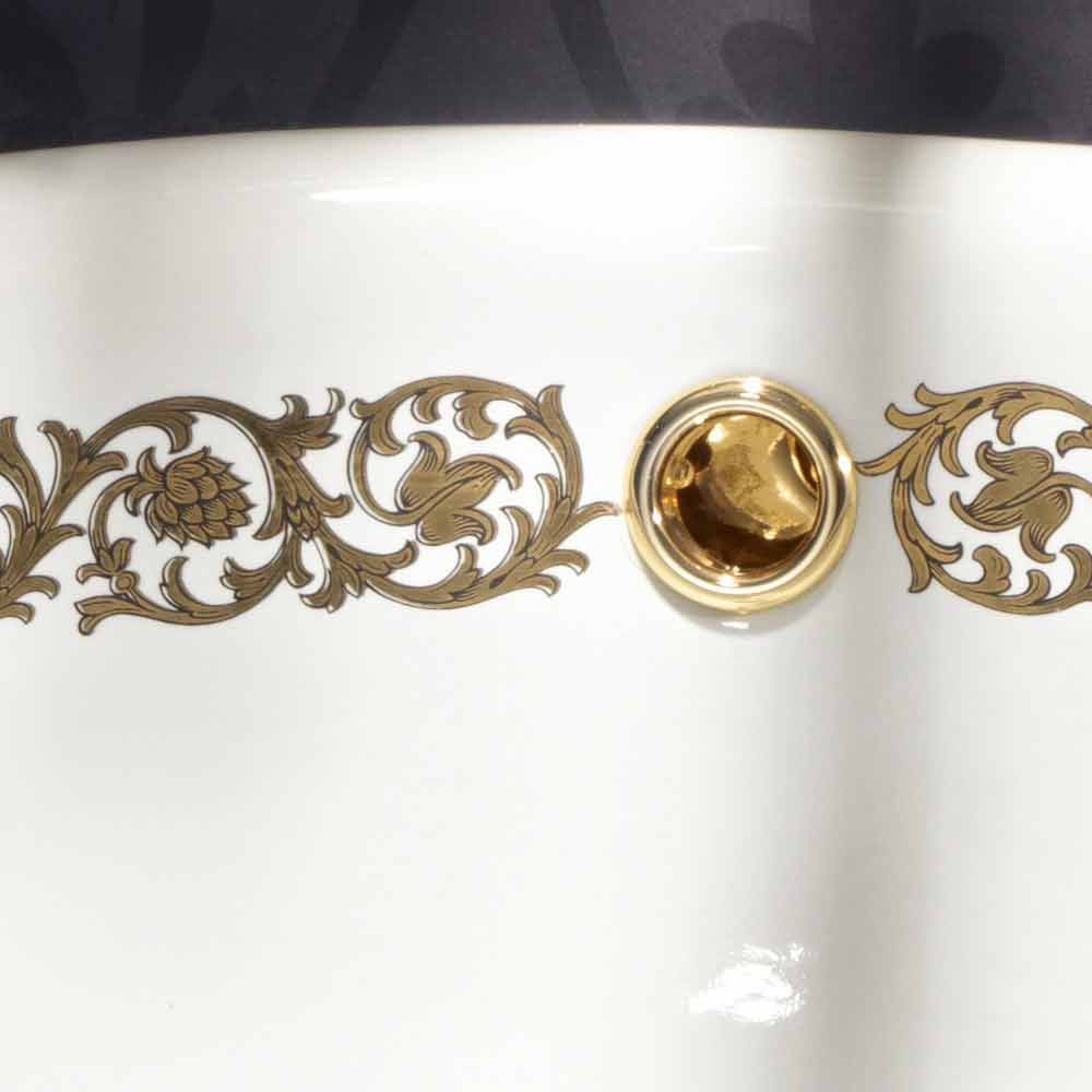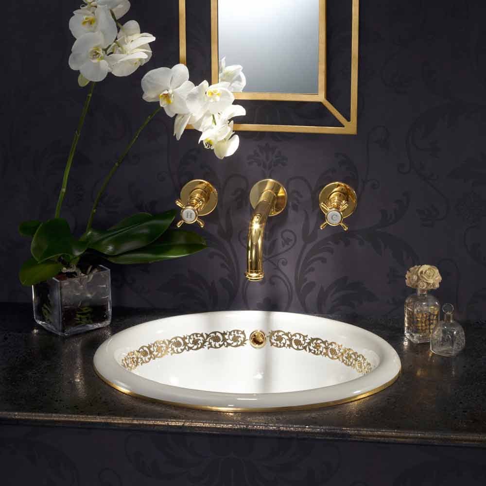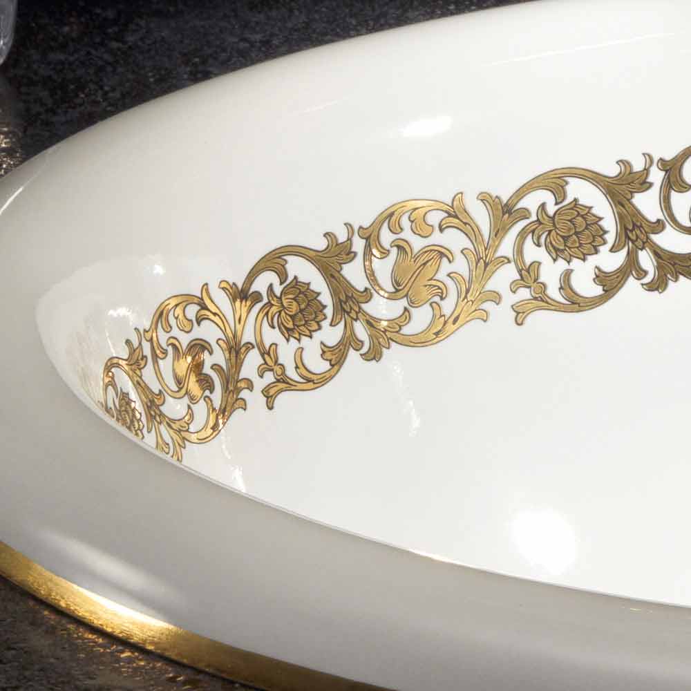 Lavabo empotrado de baño de diseño barroco hecho en Italia, Otis Fregadero incorporado en el baño hecho en Italia en arcilla de fuego, hecho a mano, decorado, con raya en cono de pino dorado y borde de oro de 24 k.