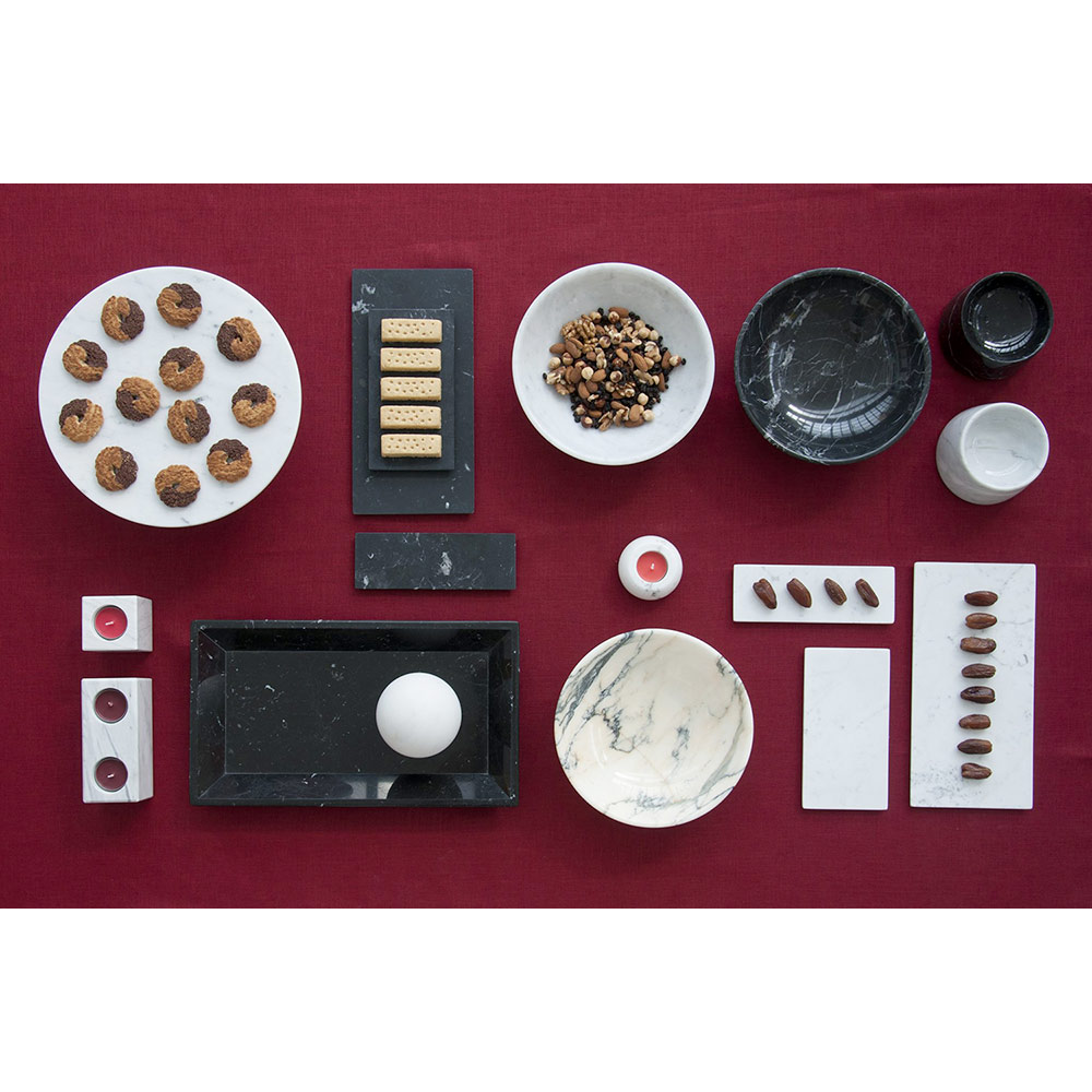 Frutero redondo caracterizado por el precioso mármol con el que está elaborado artesanalmente por profesionales especializados. Es una pieza única ya que cada bloque de mármol utilizado se diferencia de los demás por vetas y matices. Disponible en tres variantes de mármol: Portoro , Paonazzo y Marquinia . El Portoro es una preciosa variedad de mármol caracterizado por un fondo negro intenso con matices y vetas doradas, el Paonazzo es una variedad de mármol de alta calidad típico de la tradición y caracterizado por un fondo blanco mantequilla con vetas del azul intenso al naranja y finalmente el El mármol negro Marquinia se extrae de las canteras españolas y se caracteriza por sus vetas irregulares de color blanco o gris claro que le dan al mármol un aspecto original y moderno.