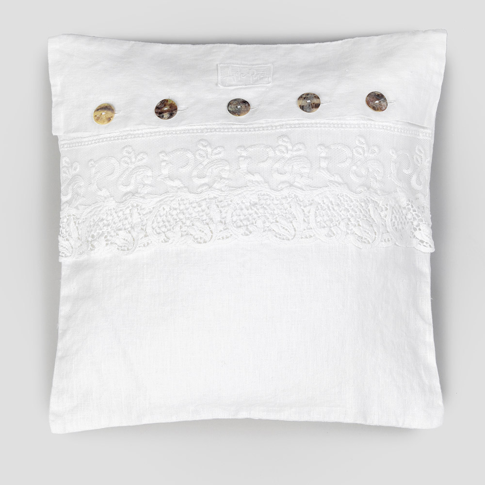 Funda de almohada cuadrada de lino blanco puro con encaje de Farnesio o tul y botones, diseño de lujo elaborado artesanalmente en Italia.