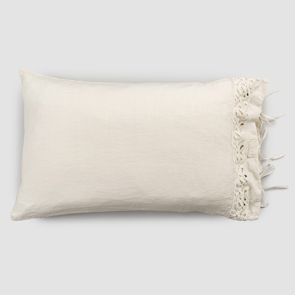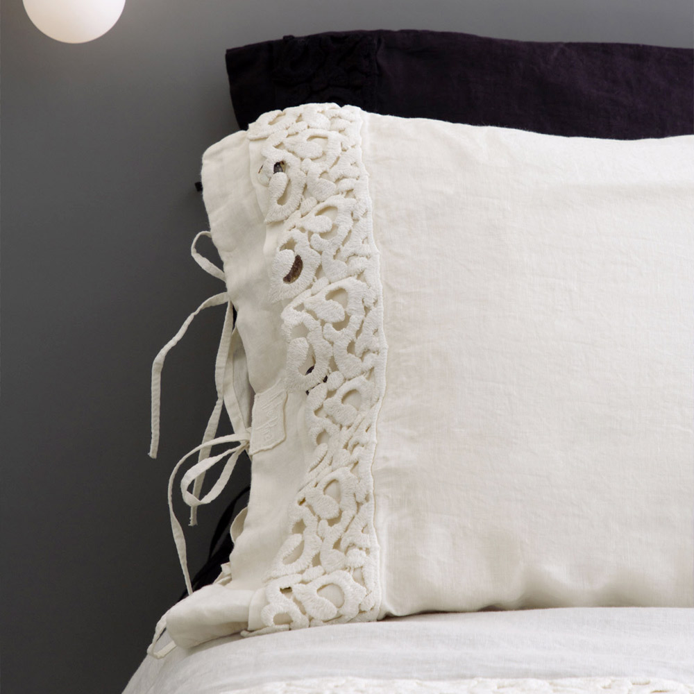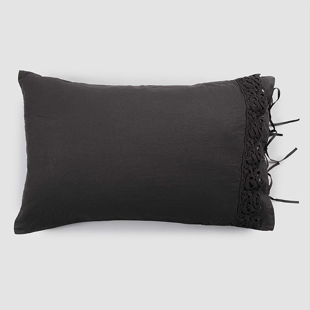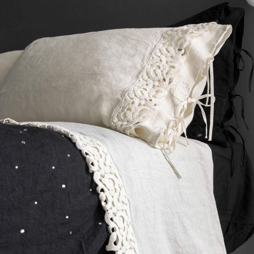 Funda de almohada en lino negro o mantequilla con encaje de poema, artículo de lujo made in Italy.