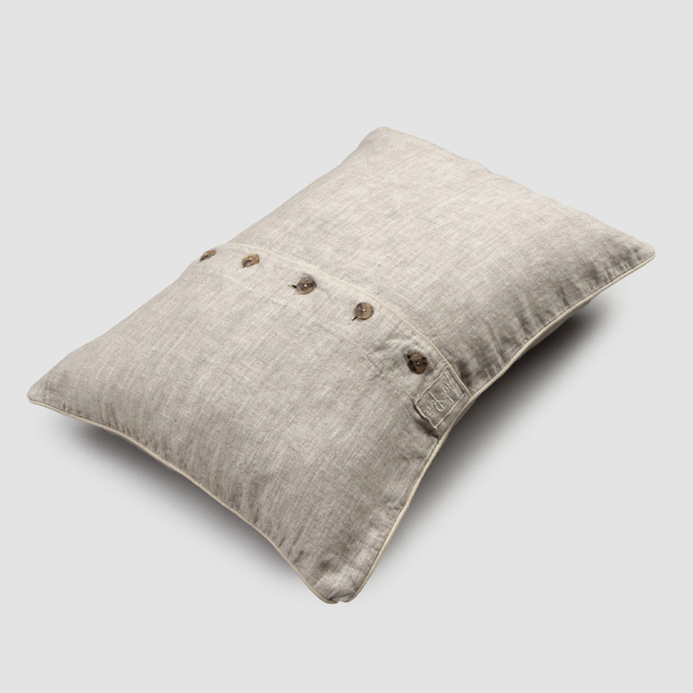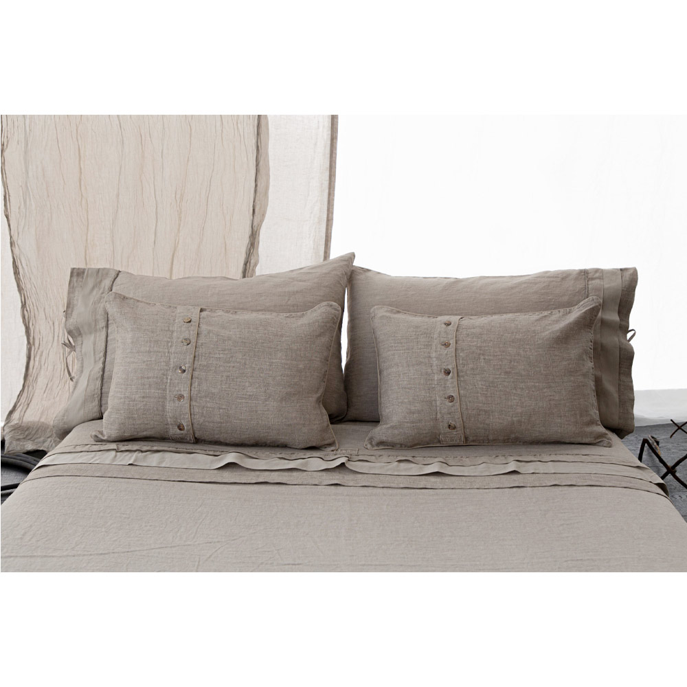 Funda de almohada rectangular de lino con encaje, botones y elegante cenefa fabricada en Italia.