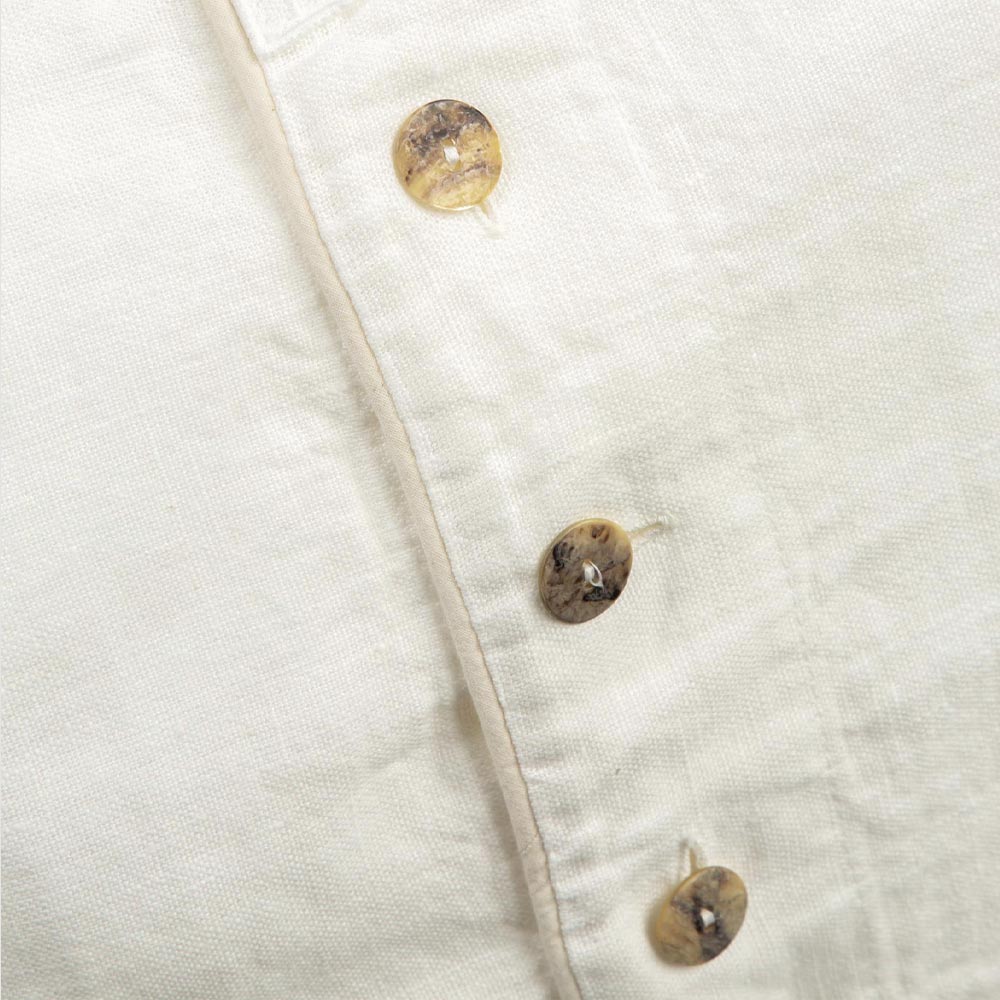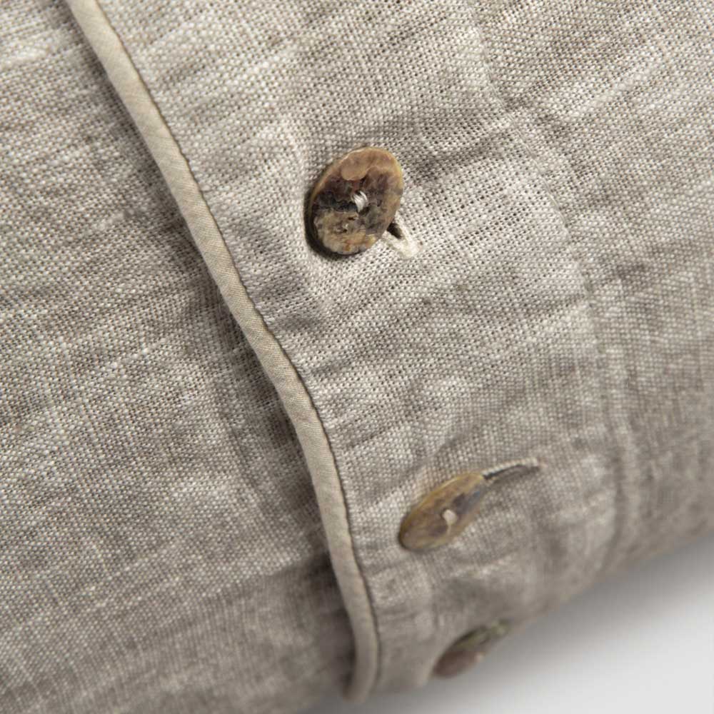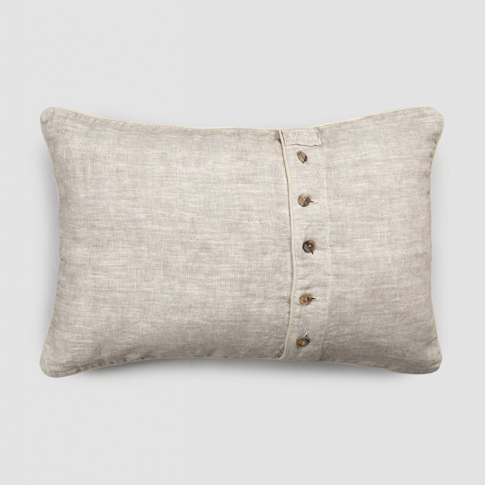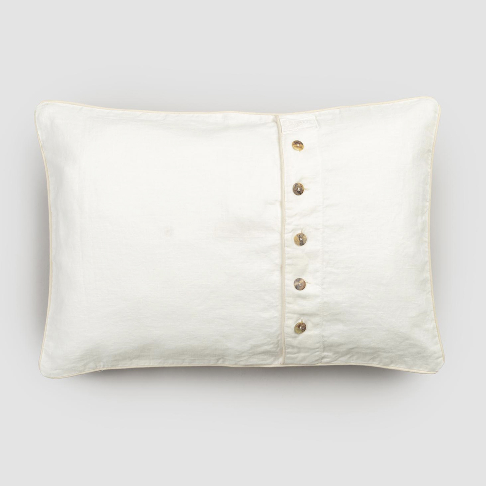 El valor de la tradición se une al estilo de vida moderno con esta funda de almohada de lino adornada con una fila central de botones y ribetes de nácar agoya.