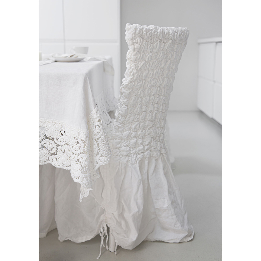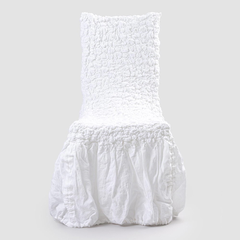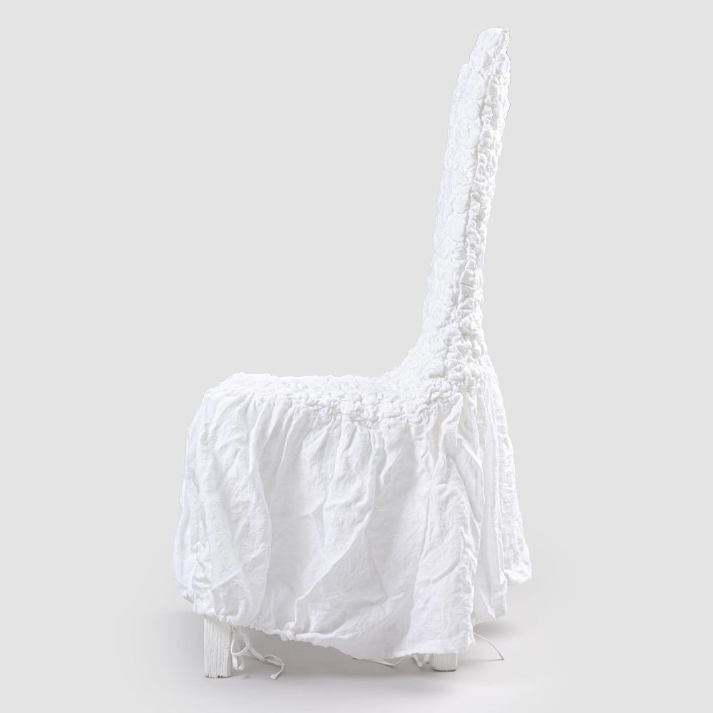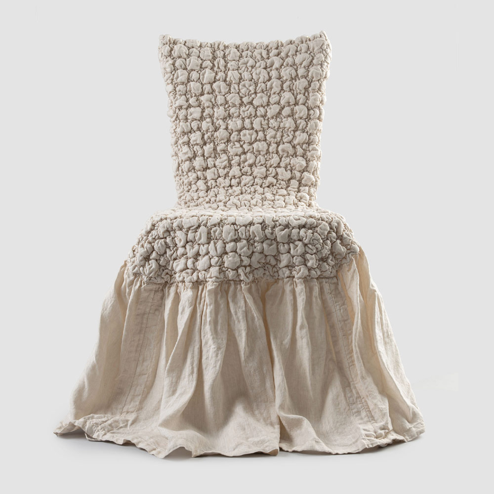 Funda de silla en lino claro gofrado con volante blanco, negro, manteca vieja o mineral viejo made in Italy.